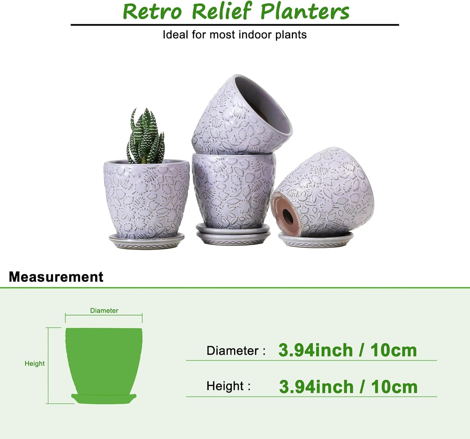 - Size & Package: 4.0 Inch Pot - Set of 4. Package: contains 4 ceramic flower pots, 4pcs mesh pads and 4pcs saucers(NOT INCLUDE PLANTS)