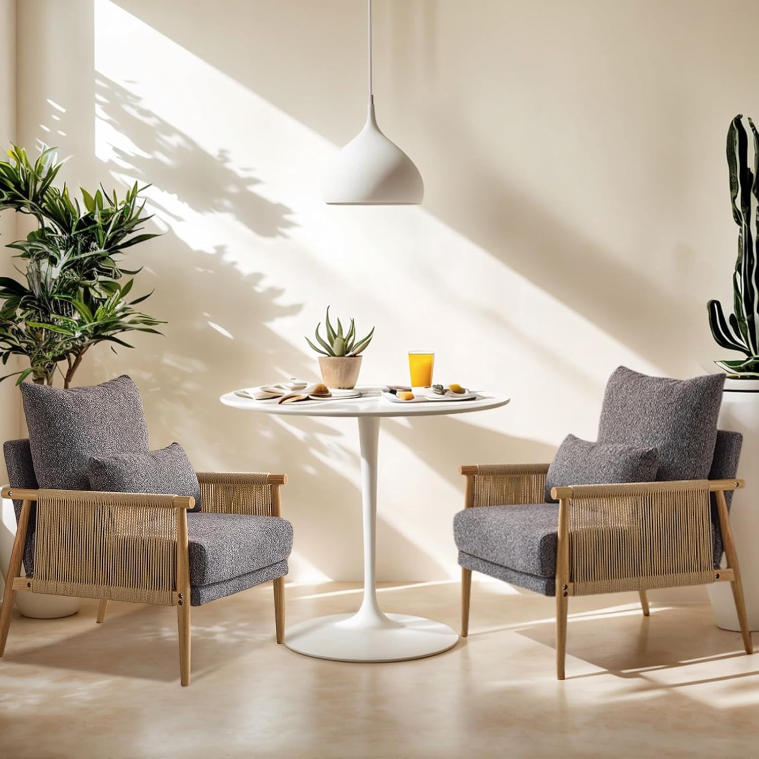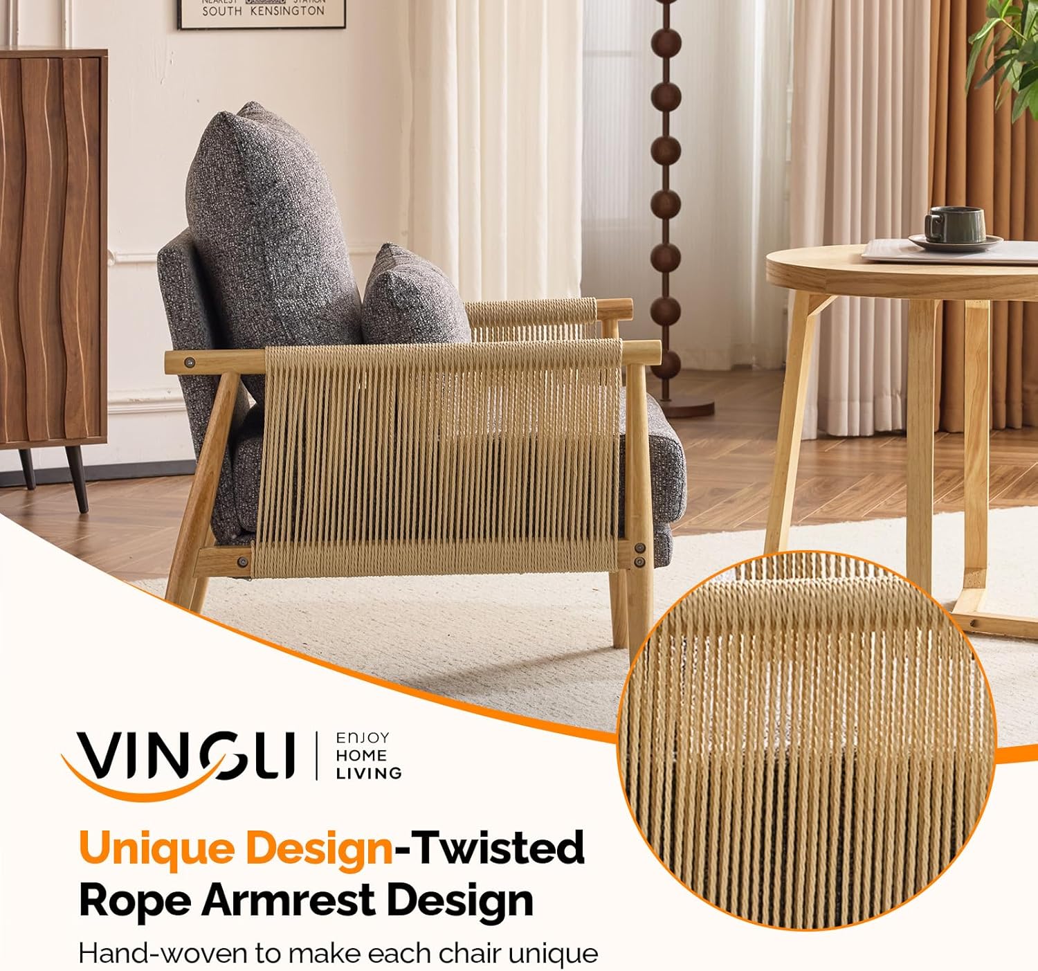 VINGLI Boho Braid Accent Armchairs Set of 2,Mid-Century Modern Chiars with Solid Wooden Armrest,Comfy Louge Cushion Chairs with Waist Pillow for Bedroom,Living Room,Reading Room, Gray