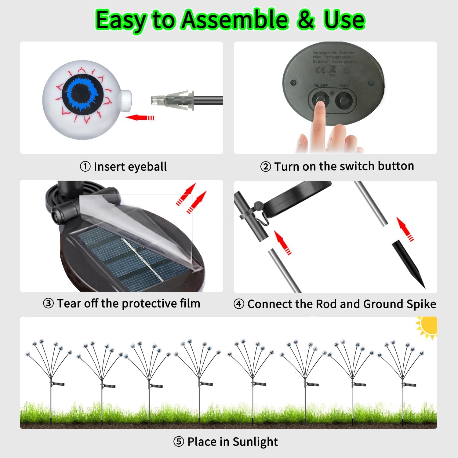 - Easy to Assemble & Widely Used: The outdoor solar lights just need insert the eyeball, then connect the rod and ground spike. They can be used in garden, yard , courtyard, path, lawn, terrace, and other places, it's the perfect choice for outdoor halloween decorations.