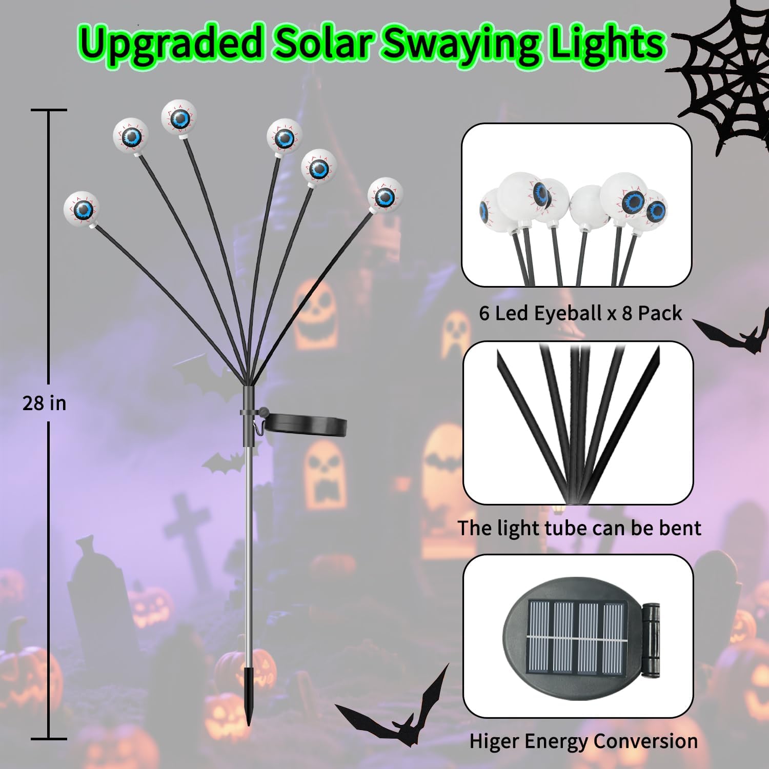 - Vivid and Horror Halloween Decor: Decorate your crazy Halloween with these 3D designed and swinging eyeball lights that appear more realistic and lifelike. The bloodshot green eyes combined with the eerie purple and orange glow, using these solar Halloween path lights to light up your Halloween, making people feel like they are in hell and chilling.