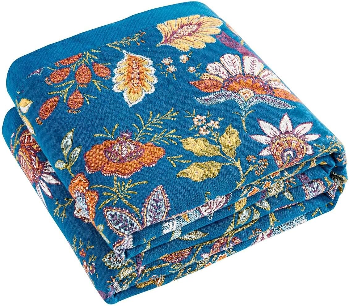 Fall Throw Blanket for Couch, Blue Boho Decorative Throw Blanket, 100% Cotton Muslin Breathable Woven Farmhouse Blankets Quilt, 90"x98" Reversible Lightweight Blankets Bohemian Throw Quilt