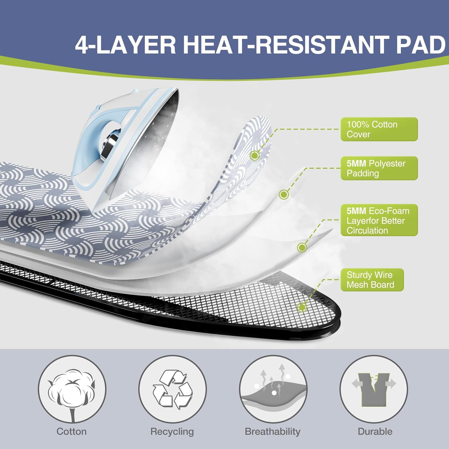 - 3-Layer Ultra-Thick Padding -Enjoy premium protection with a thick, three-layer padded cover that provides excellent cushioning and steam absorption. The special heat-resistant coating shields your garments from scorching and ensures smooth gliding and even heat distribution.
