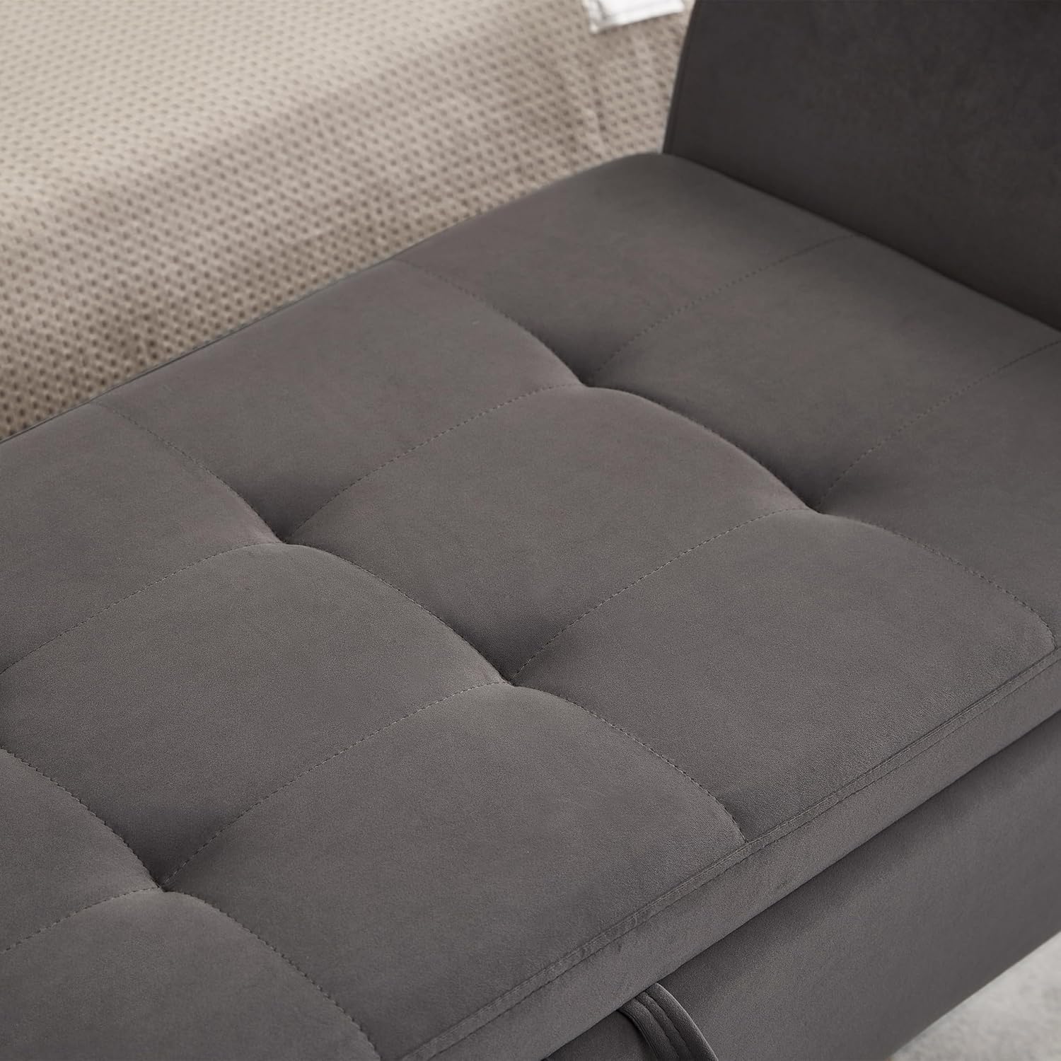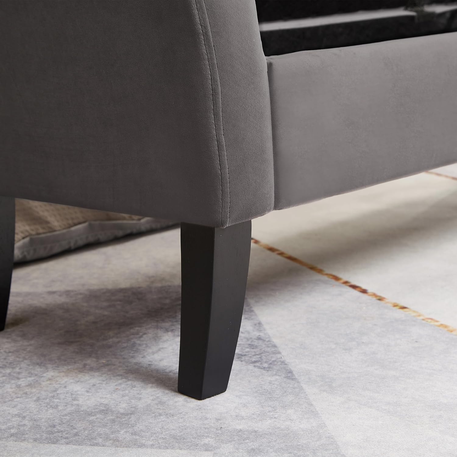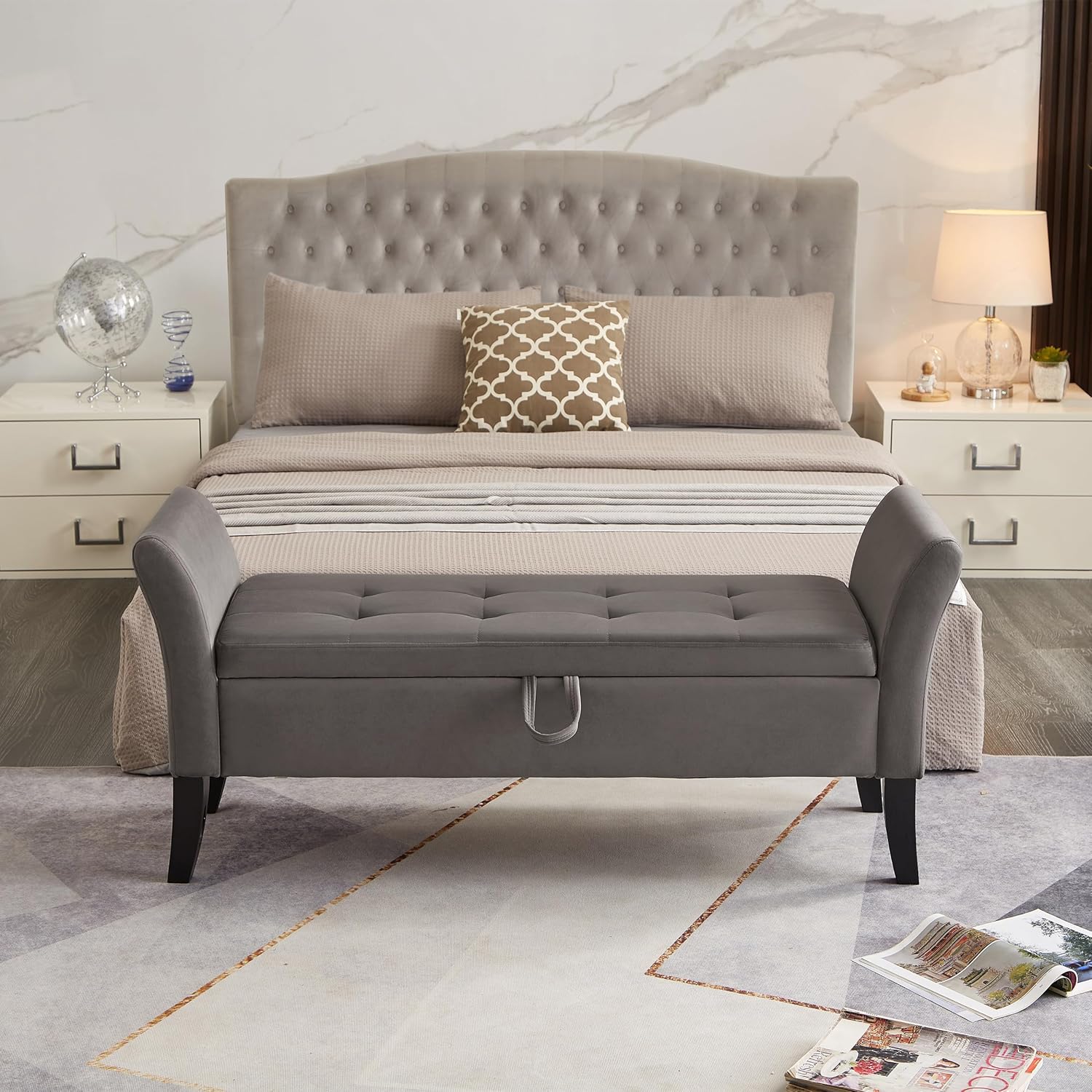 - ·Modern Design: Our storage ottoman showcases deep button tufting and elegantly rolled arms, capturing the essence of a truly modern piece. With a sophisticated structure, this bedroom storage bench embodies a minimalist style that prioritizes comfort and practicality.Diamond Stitch Button Tufting: The button-tufted stitching on the lid enhances the modern designthis of this end of bed bench. The diamond stitch pattern introduces subtle texture while maintaining optimal comfort.