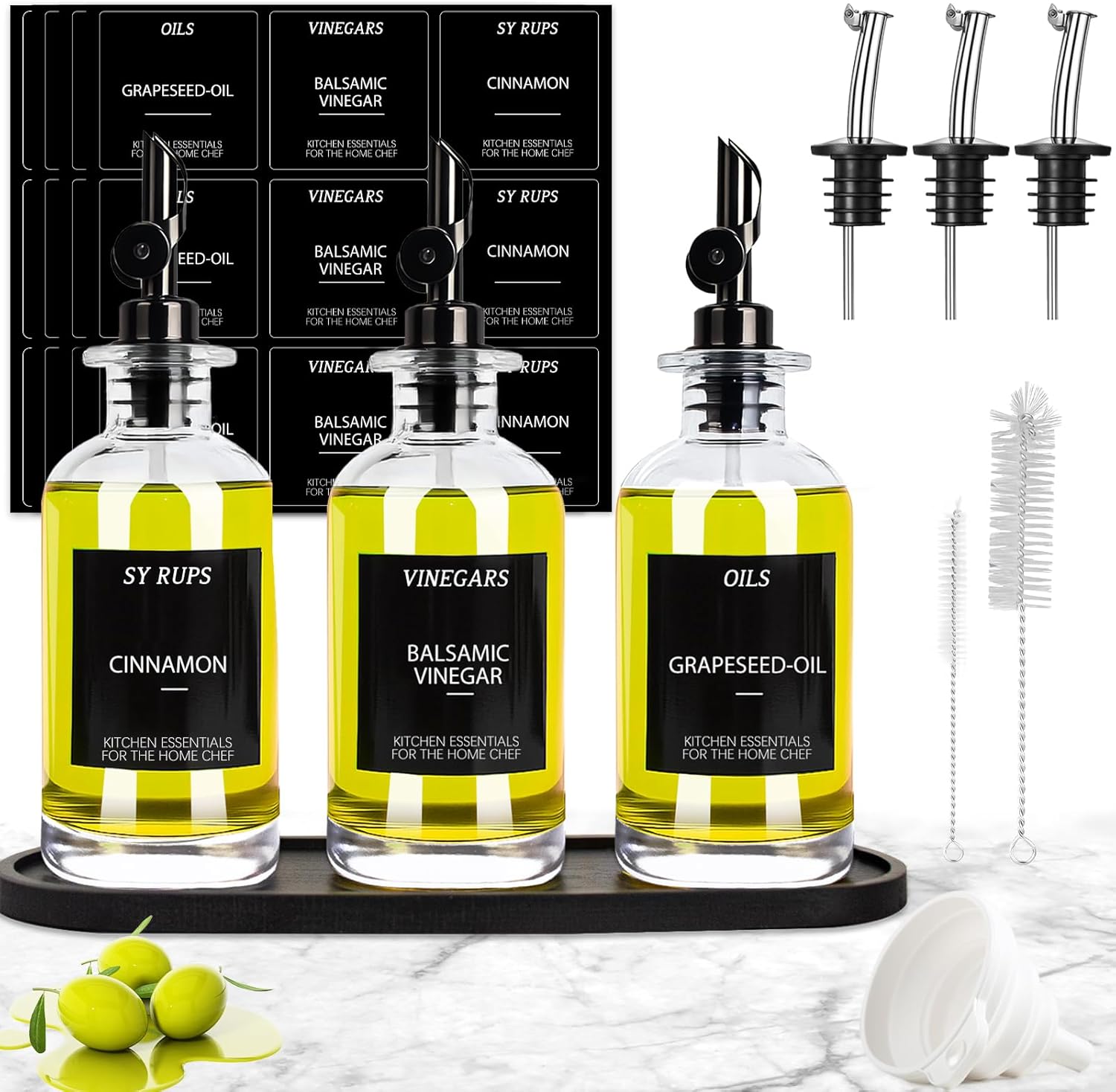 - Kitchen Oil Dispenser Set: Set of 3 premium glass olive oil dispenser bottles (perfect oil bottles for kitchen), 3 replacement spouts, a non-slip Wooden Tray, 40 labels, a funnel, and a cleaning brush β everything for organized counter tops.