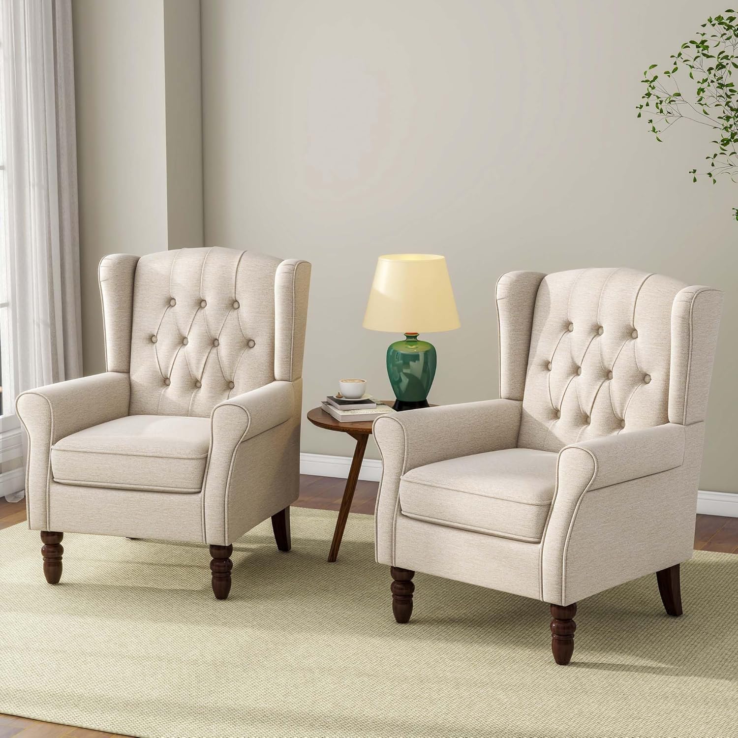 Accent Chair, Upholstered Armchair with Button Tufted High Back & Solid Wood Legs, Comfy Wingback Reading Single Sofa Chair for Small Spaces, Living Room, Bedroom (Beige, Set of 1)