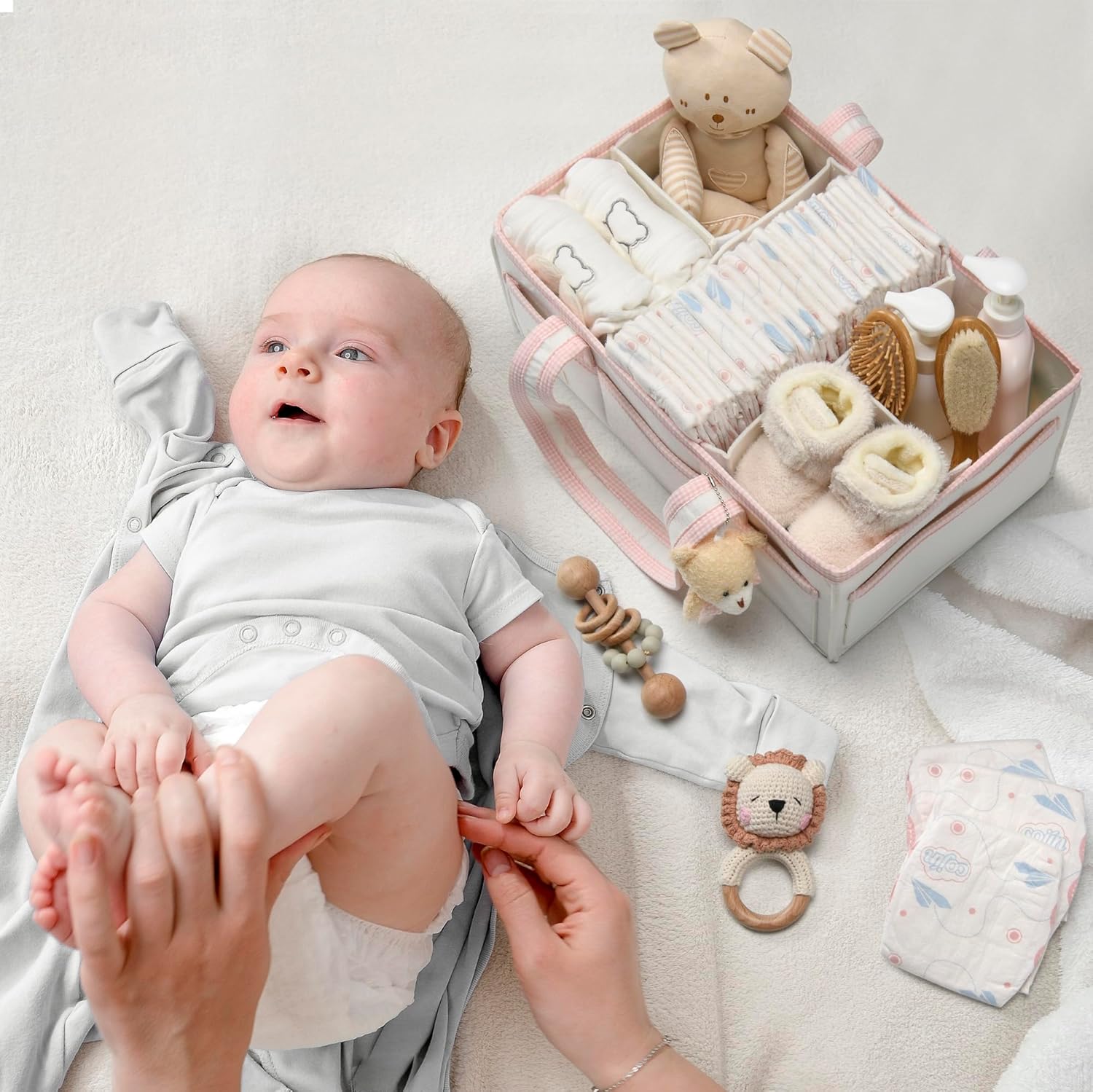 - LIGHTWEIGHT & MULTI-PURPOSE: This baby diaper caddy organizer with handle is perfect for nursery storage, car caddy, or bedside diaper changing station. Store diapers, wipes, breast pump, baby bath items, or toysโideal for travel and everyday use as baby room organizer and storage