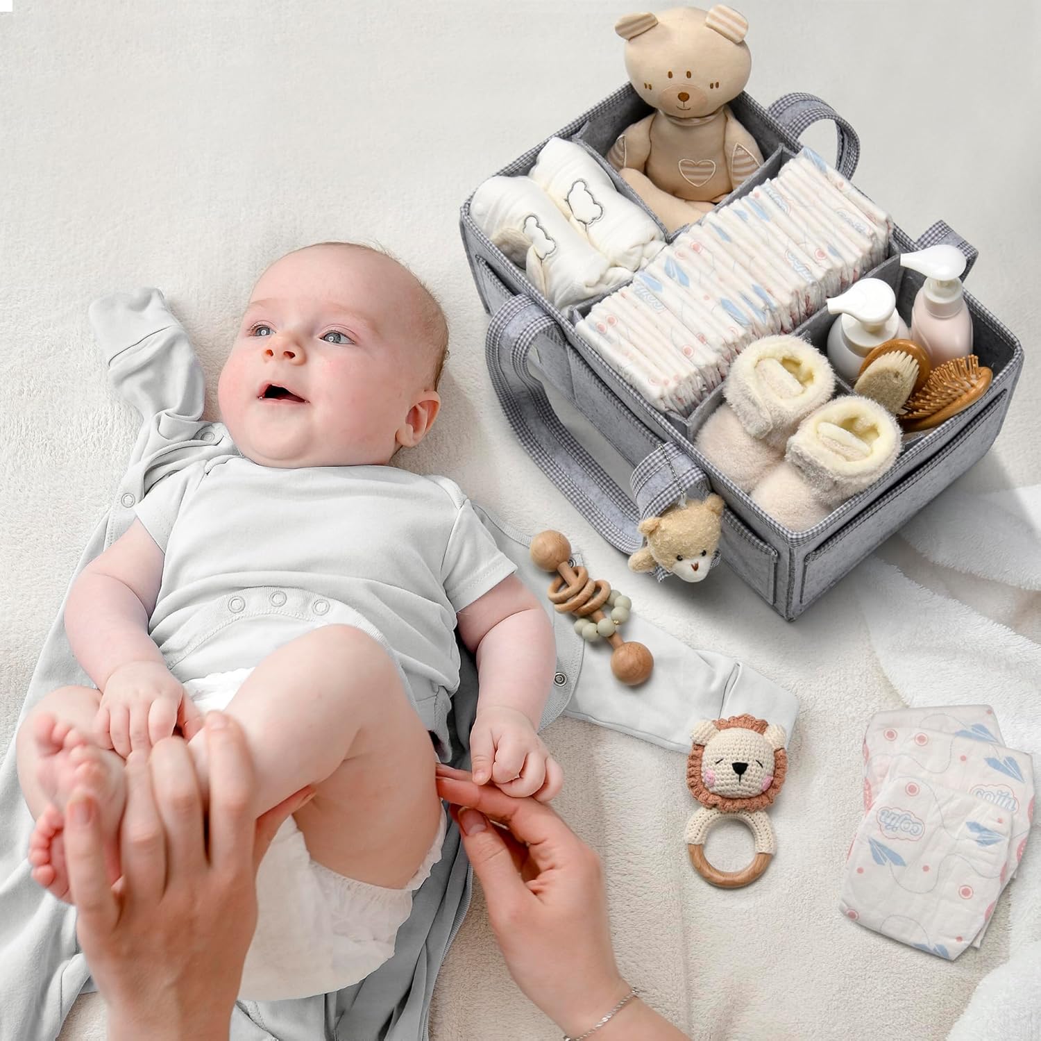 - VERSATILE AND PORTABLE DIAPER CADDY: With multiple compartments, you can easily store all of your baby stuff, baby toys storage, diapers, baby wipes, onesie, burp clothes, changing pads and other baby essentials. You can also use it as car baby organizers and storage