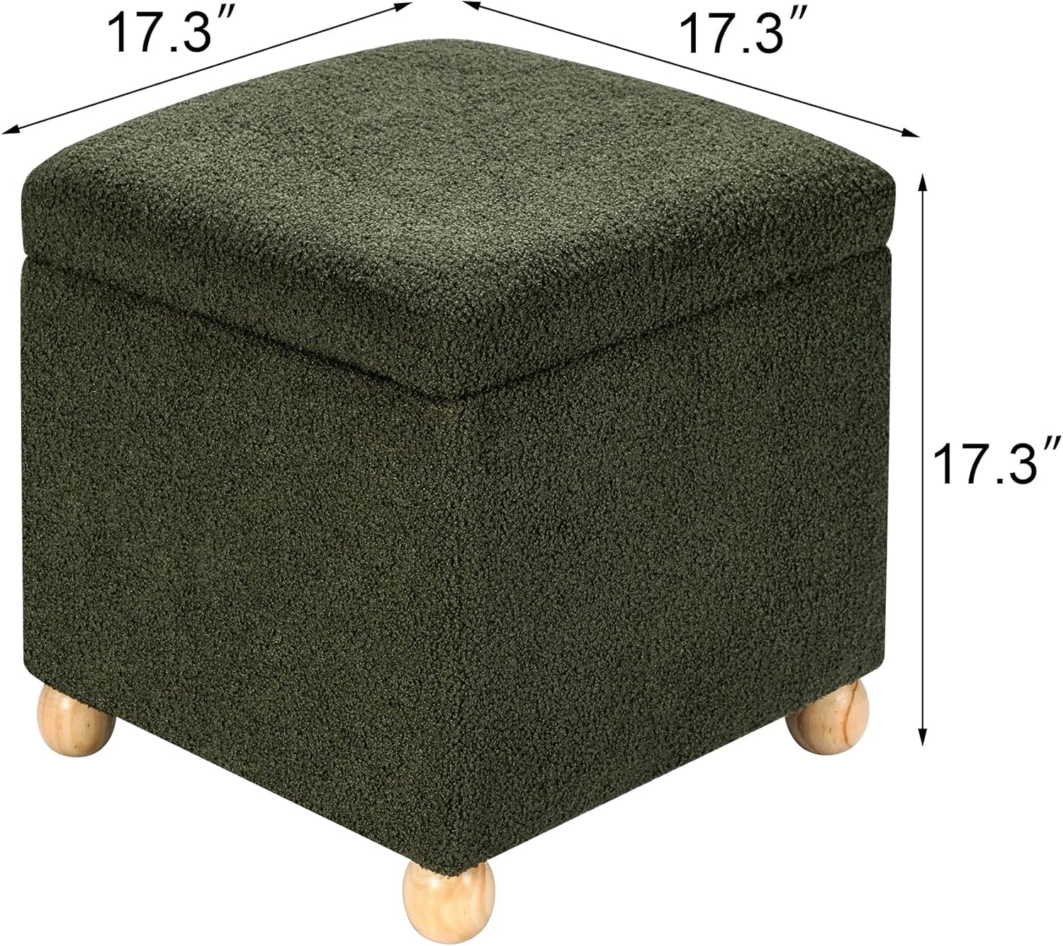Adeco 17 Inch Soft Dark Green Cube Ottoman Storage, Teddy Velvet Chair Foot Stools, Upholstered Vanity Stool with Hinged Lid, Solid Round Wood Legs