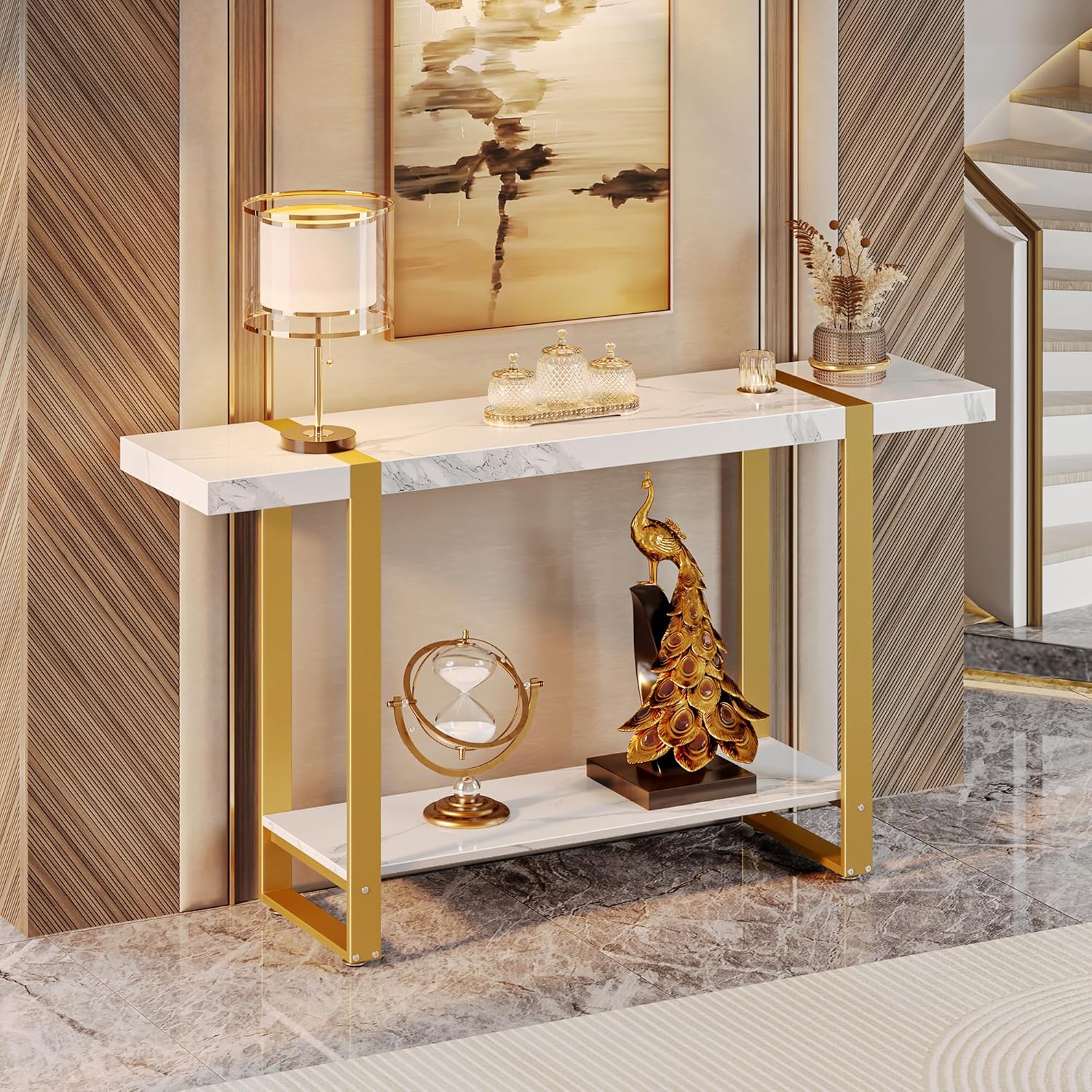 - 【Modern & Practical T-Frame Entry Table】This gold marble console table features a unique T-shaped gold metal frame that brings a sleek, balanced look to any space. Paired with a white faux marble top, it delivers a clean, modern aesthetic that fits effortlessly into both contemporary and transitional homes