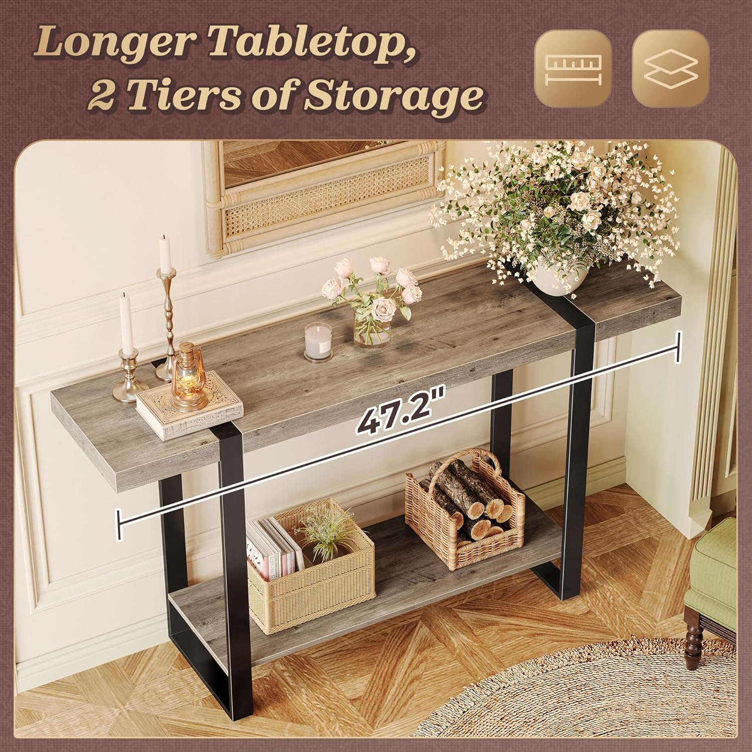 - 【Sized Right for Any Room】At 47.2” length, this narrow entryway table is just the right size to suit a variety of spaces. Whether you're styling a hallway table, entry way table, or the back of your sofa, it adds surface space and style easily. Adjustable feet keep this hall table balanced on any floor surface
