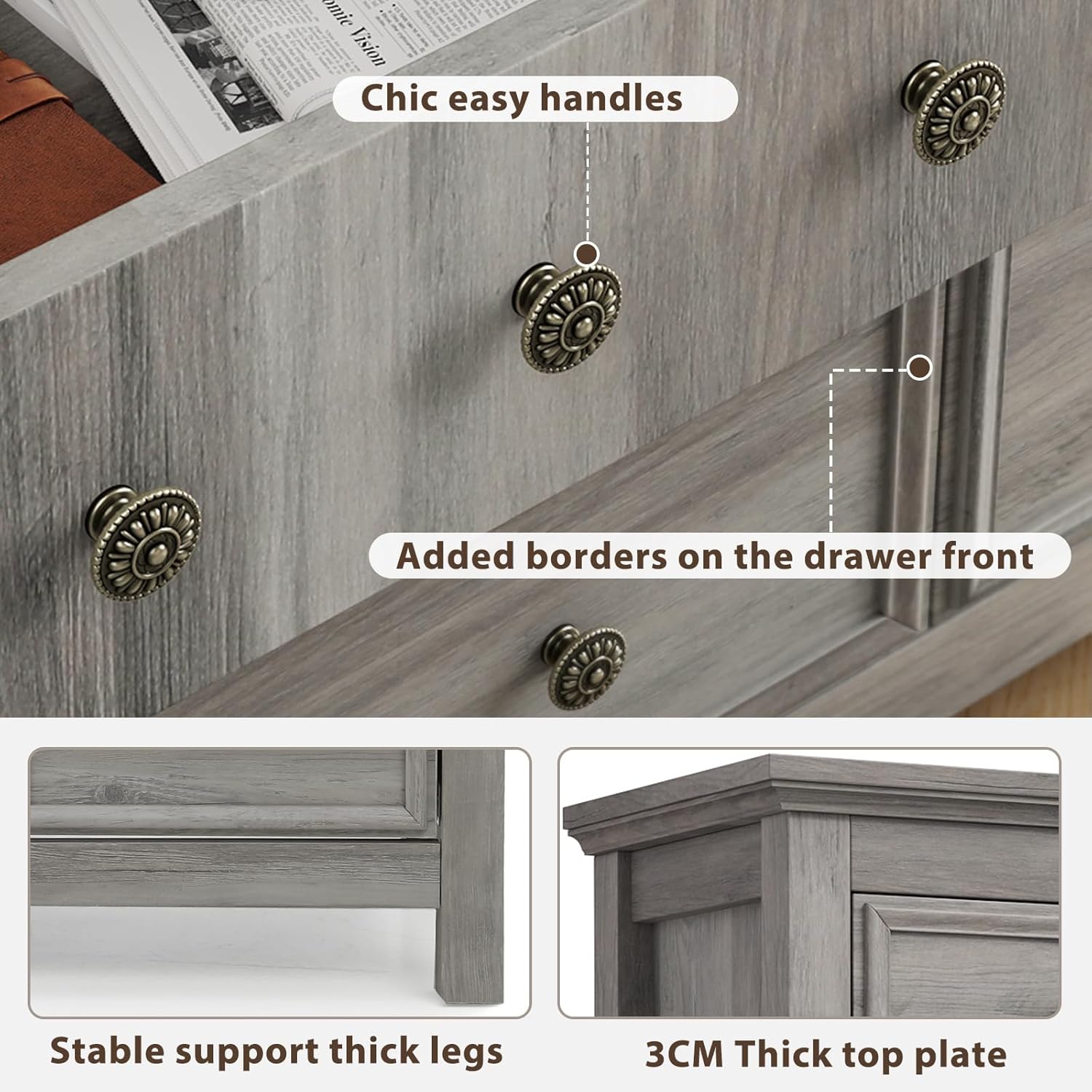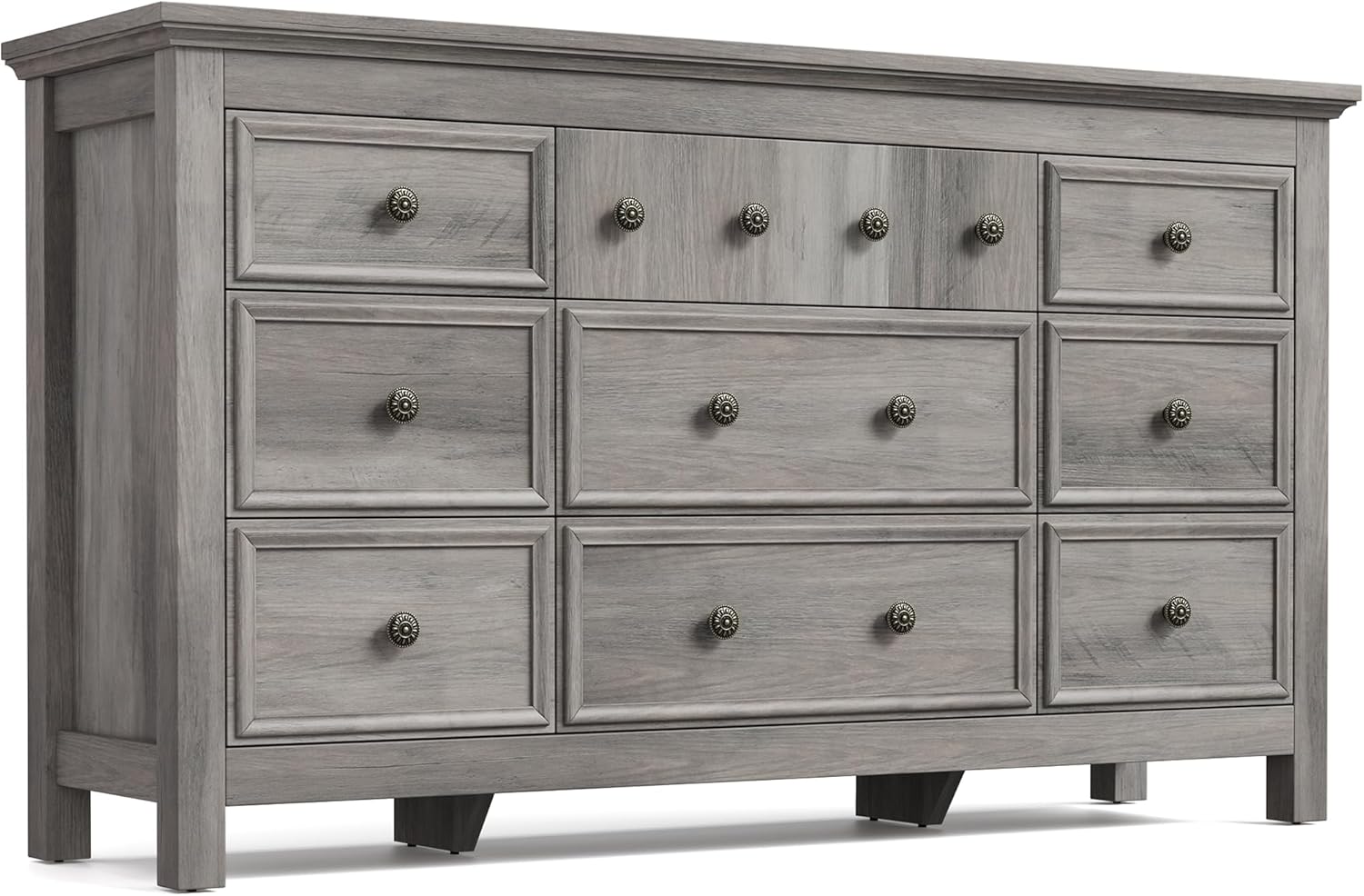 - γVersatile, Stylish Dresserγ This drawer dresser offers an array of possibilities for your home organization. Its spacious tabletop serves as a stylish canvas to beautifully showcase framed photos, artistic accents, and more. It features 9 smooth-glide drawers, offering efficient storage solutions. Keep your space neat and tidy by conveniently stowing clothing, bedding, cosmetics, jewelry, and more. Perfect for bedroom, living room, hallway, entryway.