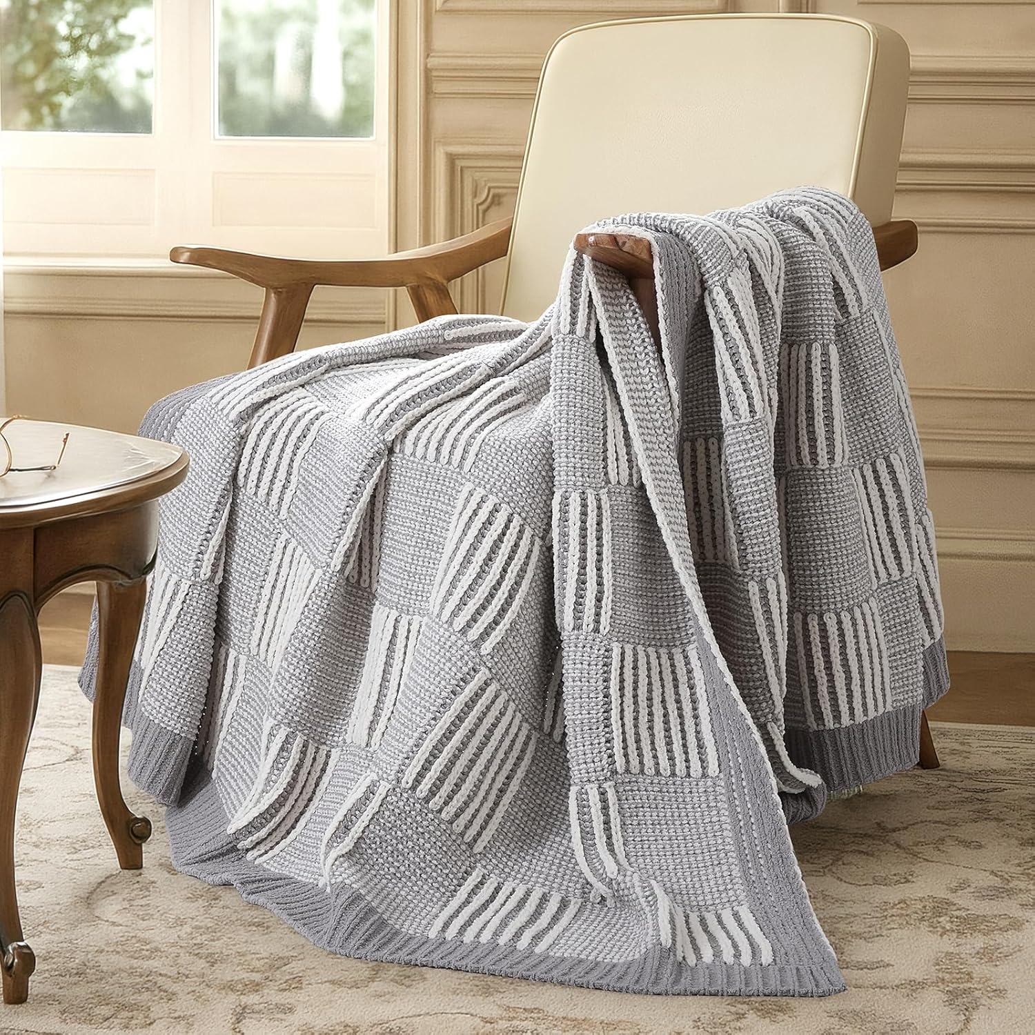 Amélie Home Chenille Knit Throw Blanket for Couch, Checkered Texture Decorative Soft Blanket for Sofa, Bed & Living Room, 50"x60", Grey & White