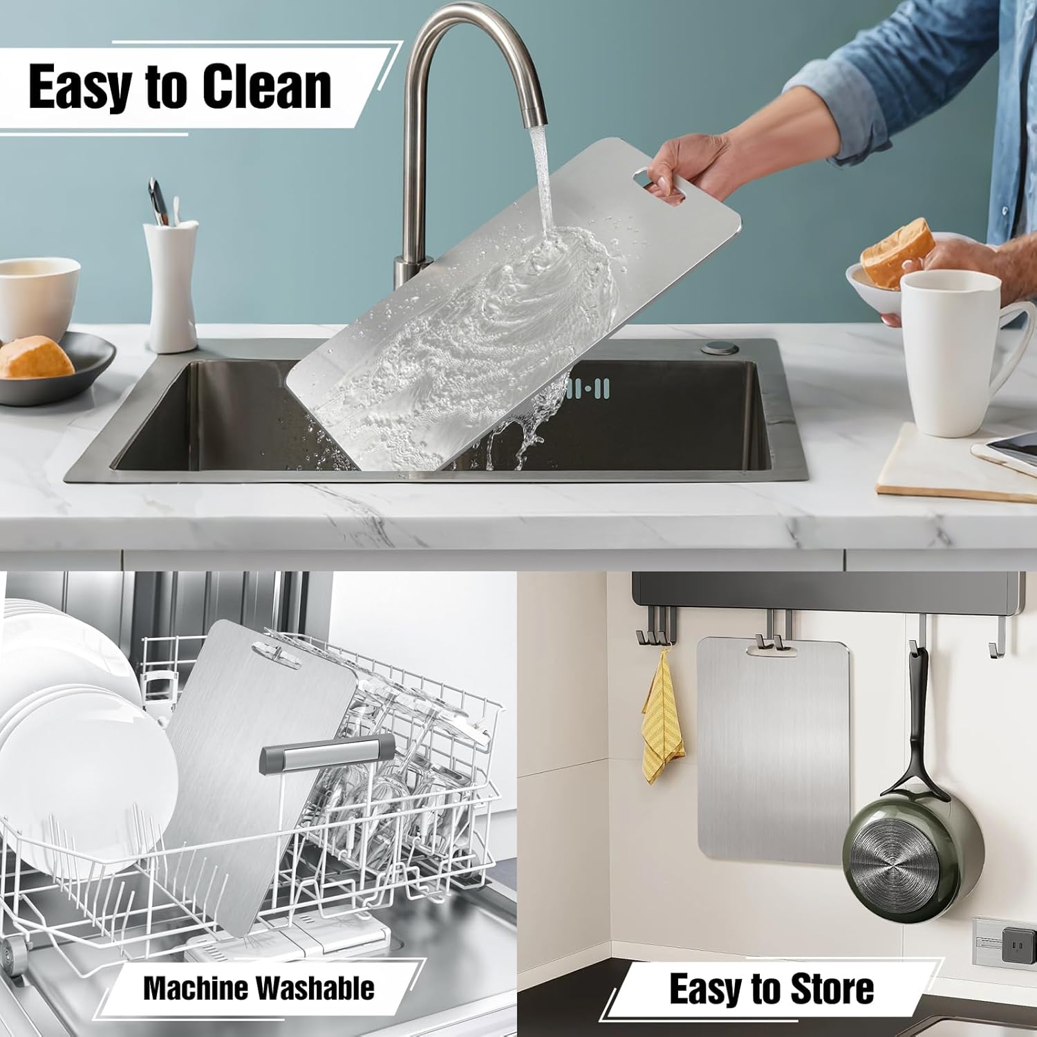 - 【Durable and Long-Lasting】With a 1.5mm thick design, it is resistant to cuts, abrasion, and heavy chopping. It will not warp, rust, or crack, outlasting wooden or plastic boards. A long-lasting and practical choice for your kitchen.