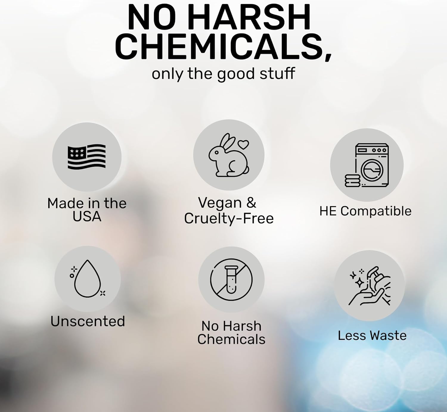 - YOUR CLOTHES WILL LOVE IT - We designed this concentrated blend of gentle washing detergents and natural fragrances to soften and reduce wrinkles and eliminate odors, stains, and dirt. Our high efficiency laundry detergent is ideal for everyday laundry, including cottons, linens, blends, and durable synthetics. It's also safe for whites and all colors, and you can use it in hot, cold, hard, or soft water.