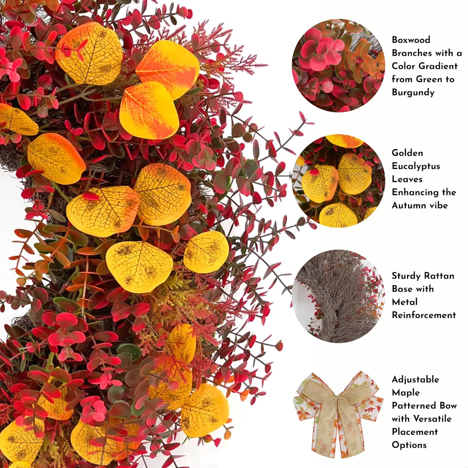 CYANBLOOM Fall Front Door Wreath: 24 Inch Large Burgundy Boxwood Eucalyptus Wreaths with Maple Bow for Rustic Farmhouse Decor - Weatherproof Outdoor Indoor All Season - Thanksgiving Halloween Decor