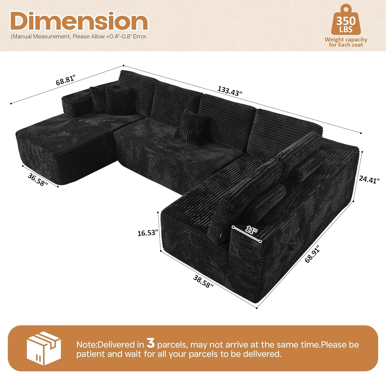 Cloud Sectional Couches for Living Room,U Shaped Modular Sofas No Assembly,133x68 Inches Plush Corduroy Oversized Floor Couch Set with Deep Seat Chaise,Black