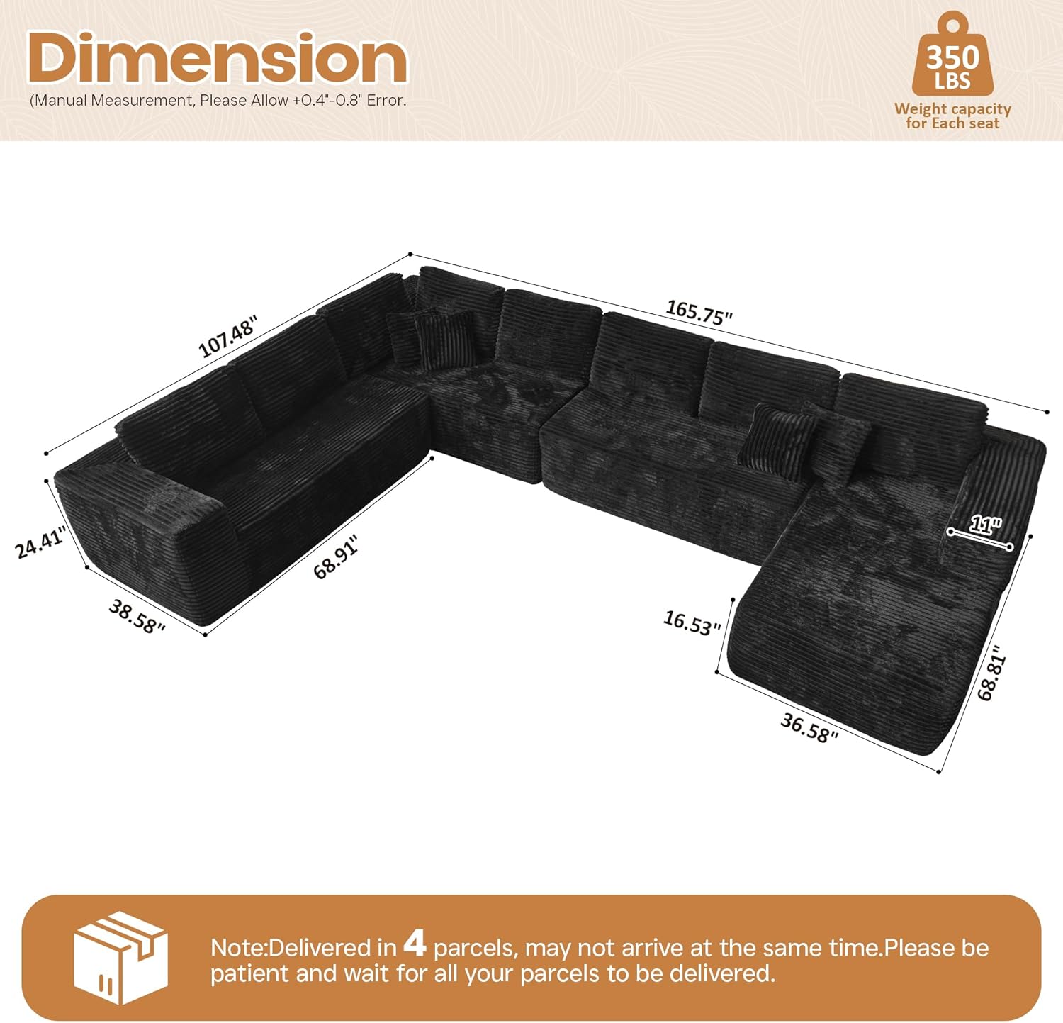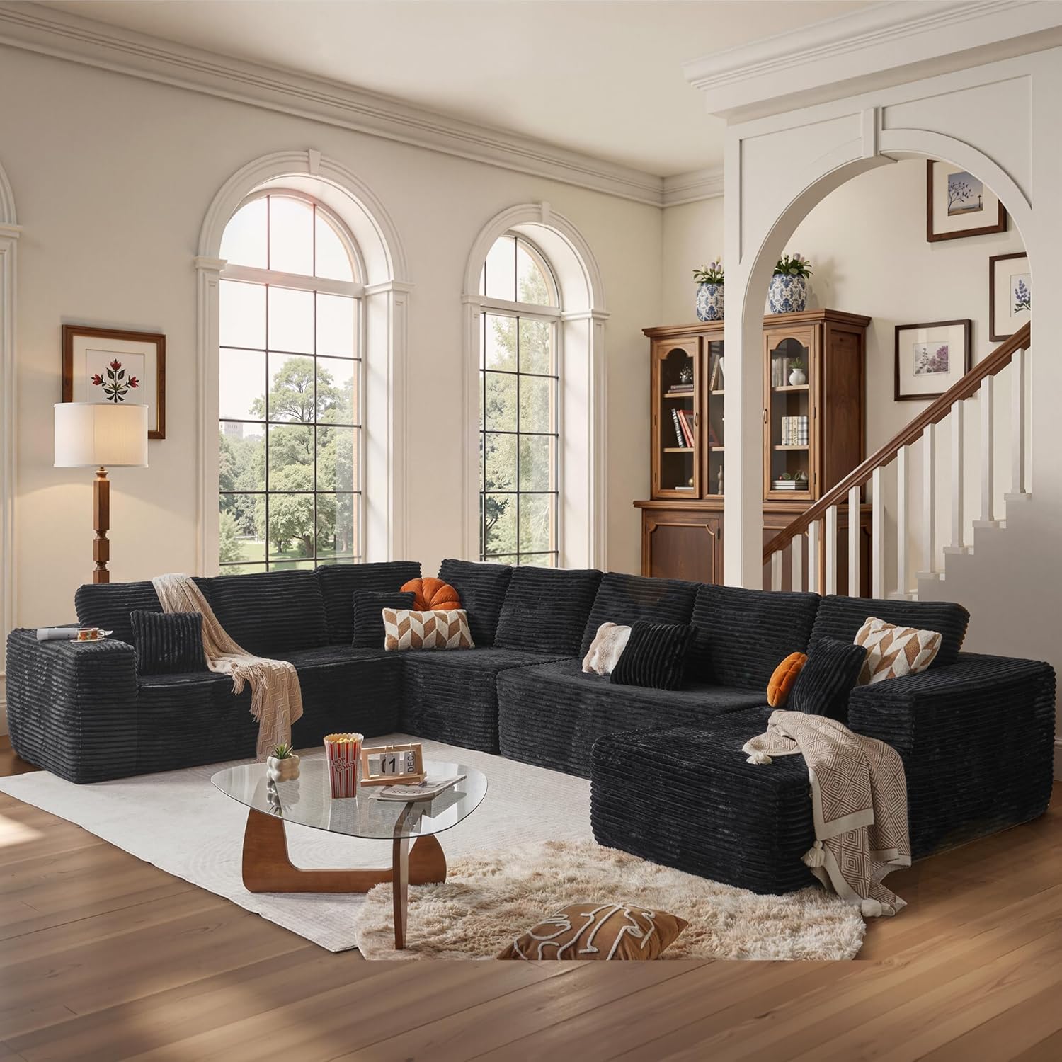 Cloud Sectional Couches for Living Room,U Shaped Modular Sofas No Assembly,165x107 Inches Plush Corduroy Oversized Floor Couch Set with Deep Seat Chaise,Black