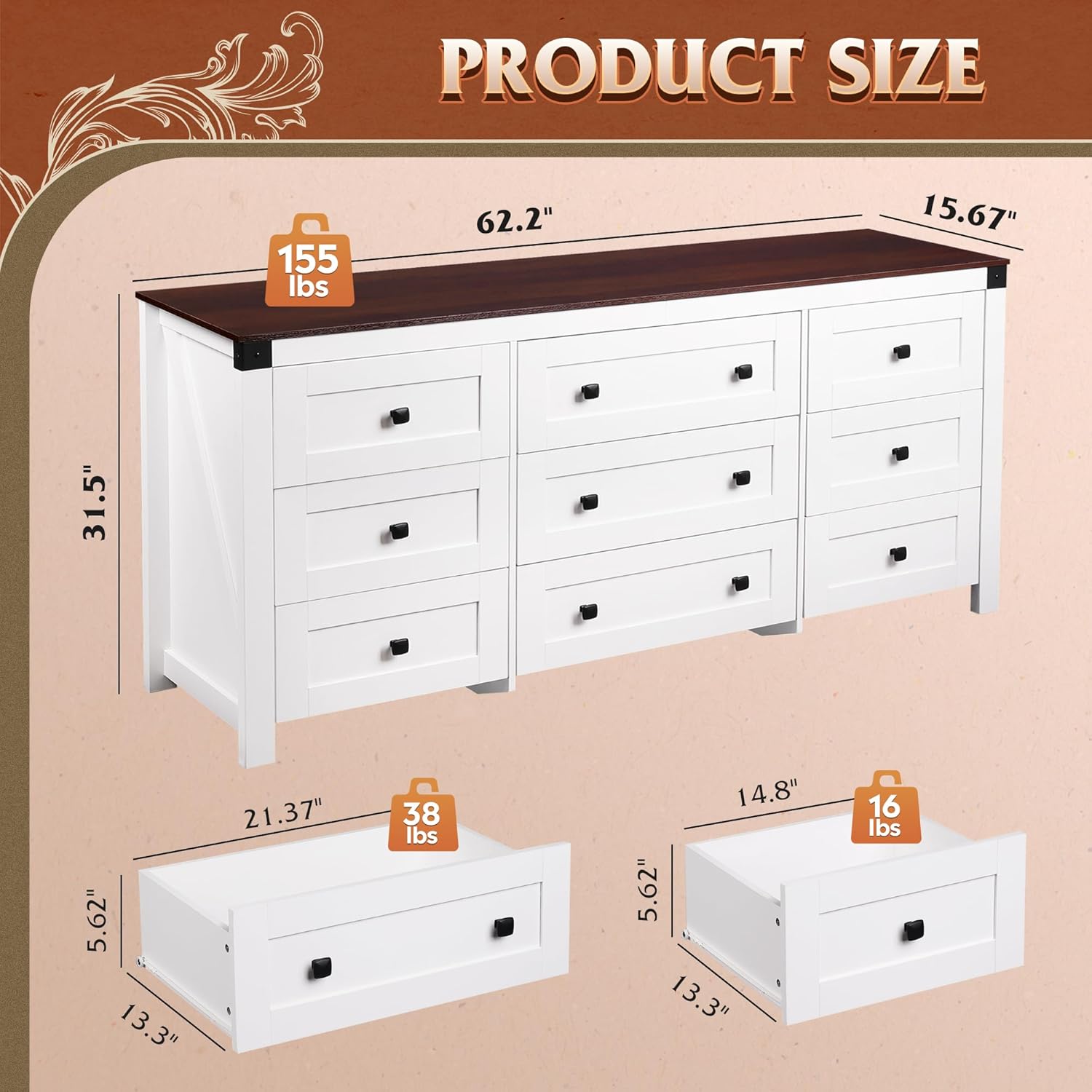 - πγSpacious Storage Space:γ15.67"D x 62.20"W x 31.50"H. This chest of drawers comes with six 13.31-inch depth, 14.8-inch width drawers, three 13.31-inch depth, 21.37-inch width drawers, providing as much storage space as possible for different items, effectively keeping your room neat and organized. The wood top is perfect for placing a TV up to 70" TV and frequently used items.
