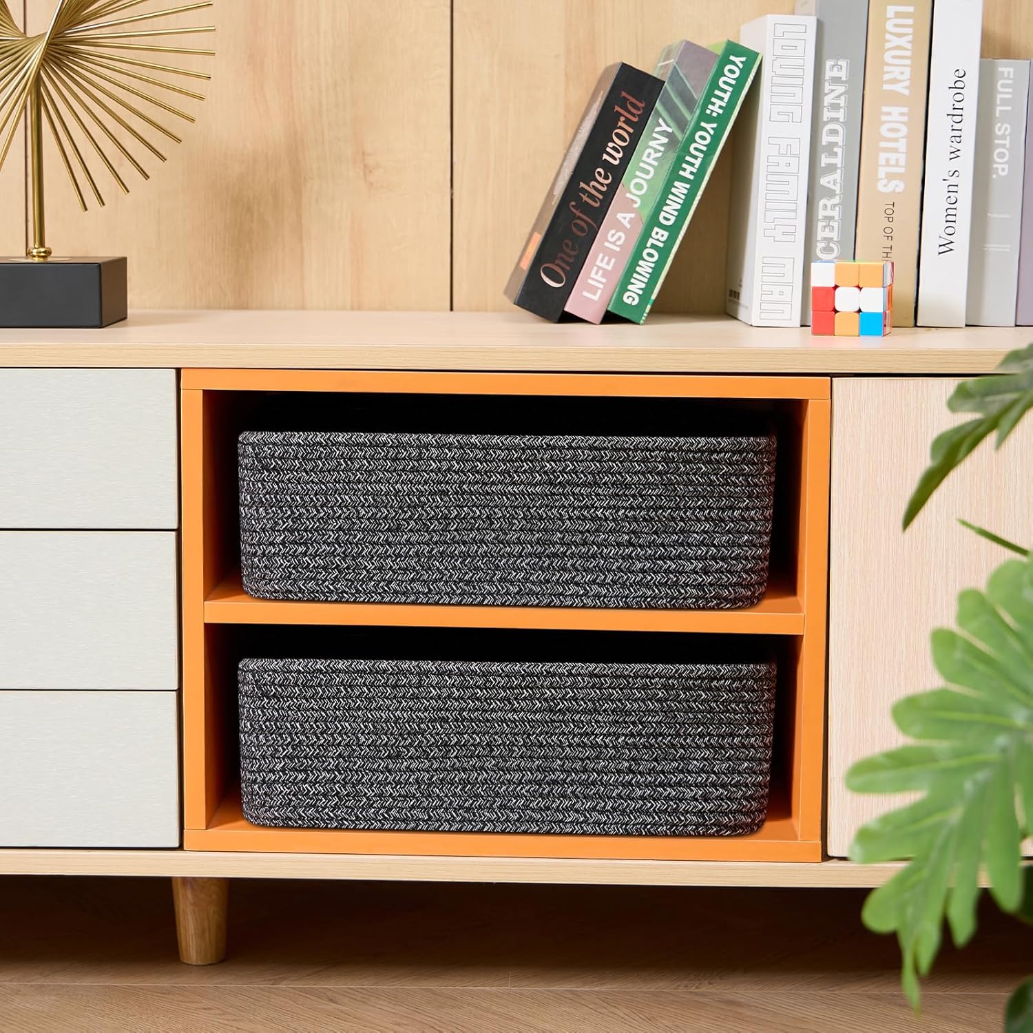 Large Shallow Organizing Baskets 15x11x5.1 Inches - Rope Woven Storage Bins for Bathroom, Shelves, Cube Closet, Mixed Black 2 Packs