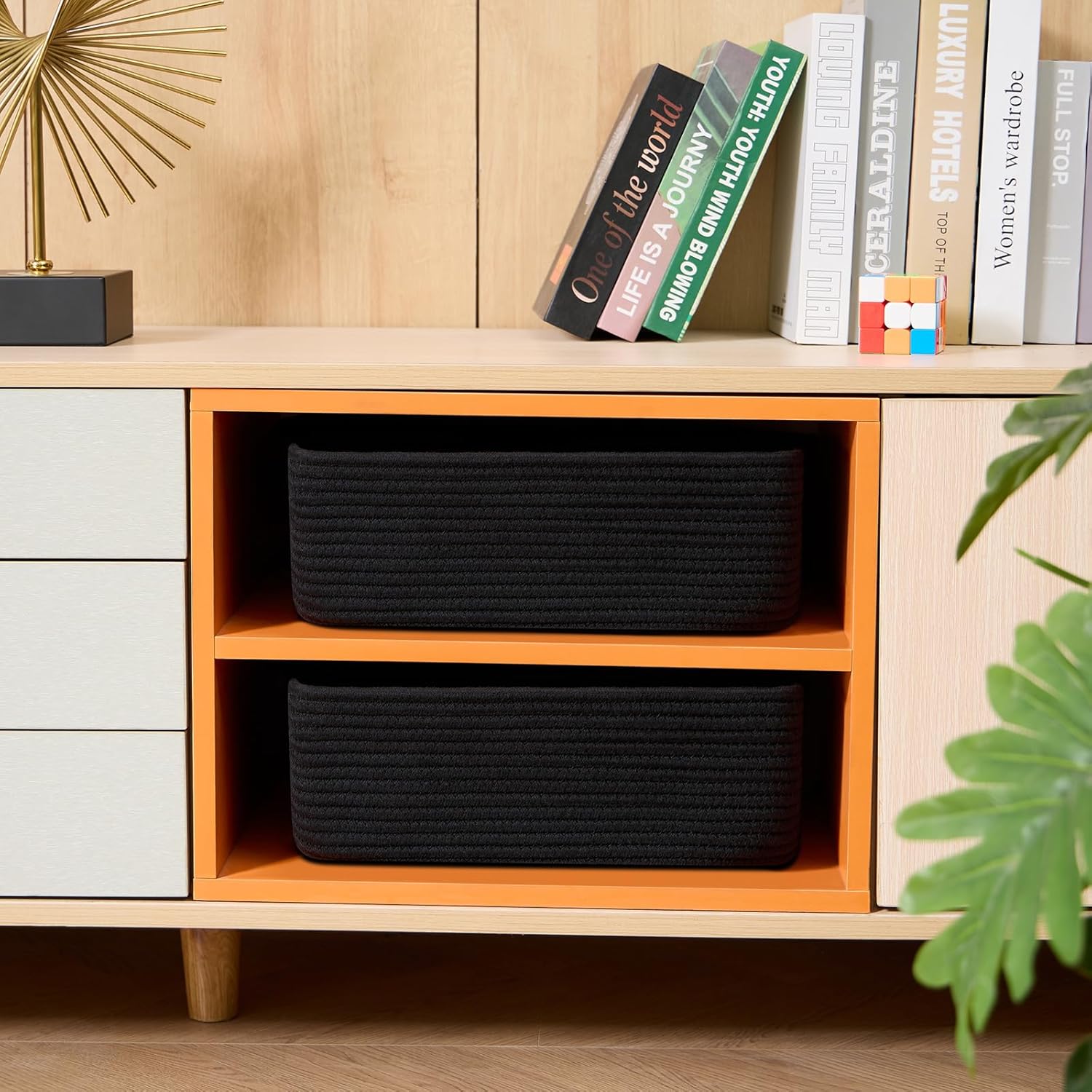 Large Shallow Organizing Baskets 15x11x5.1 Inches - Rope Woven Storage Bins for Bathroom, Shelves, Cube Closet, Black 2 Packs