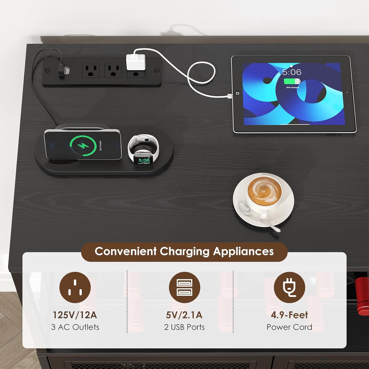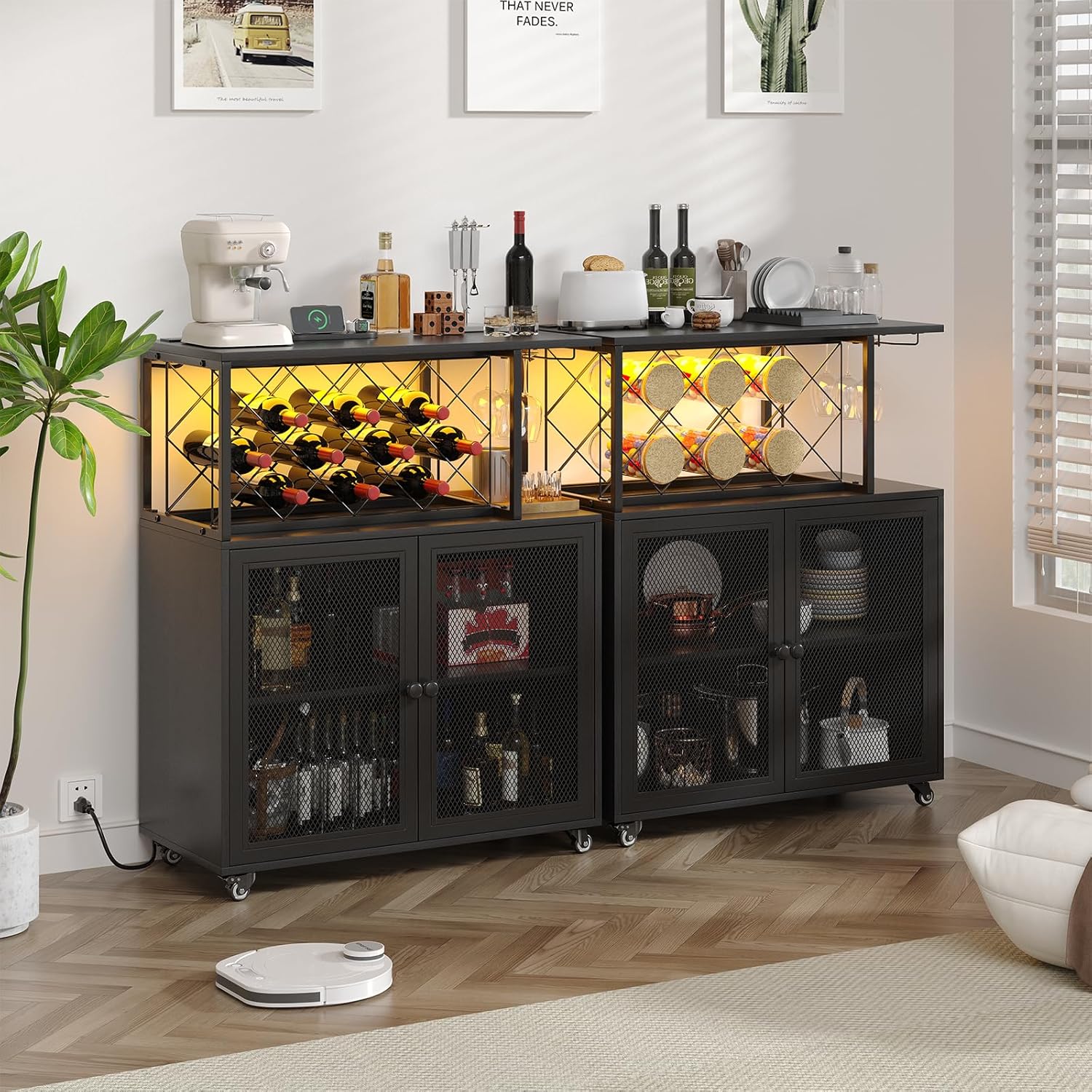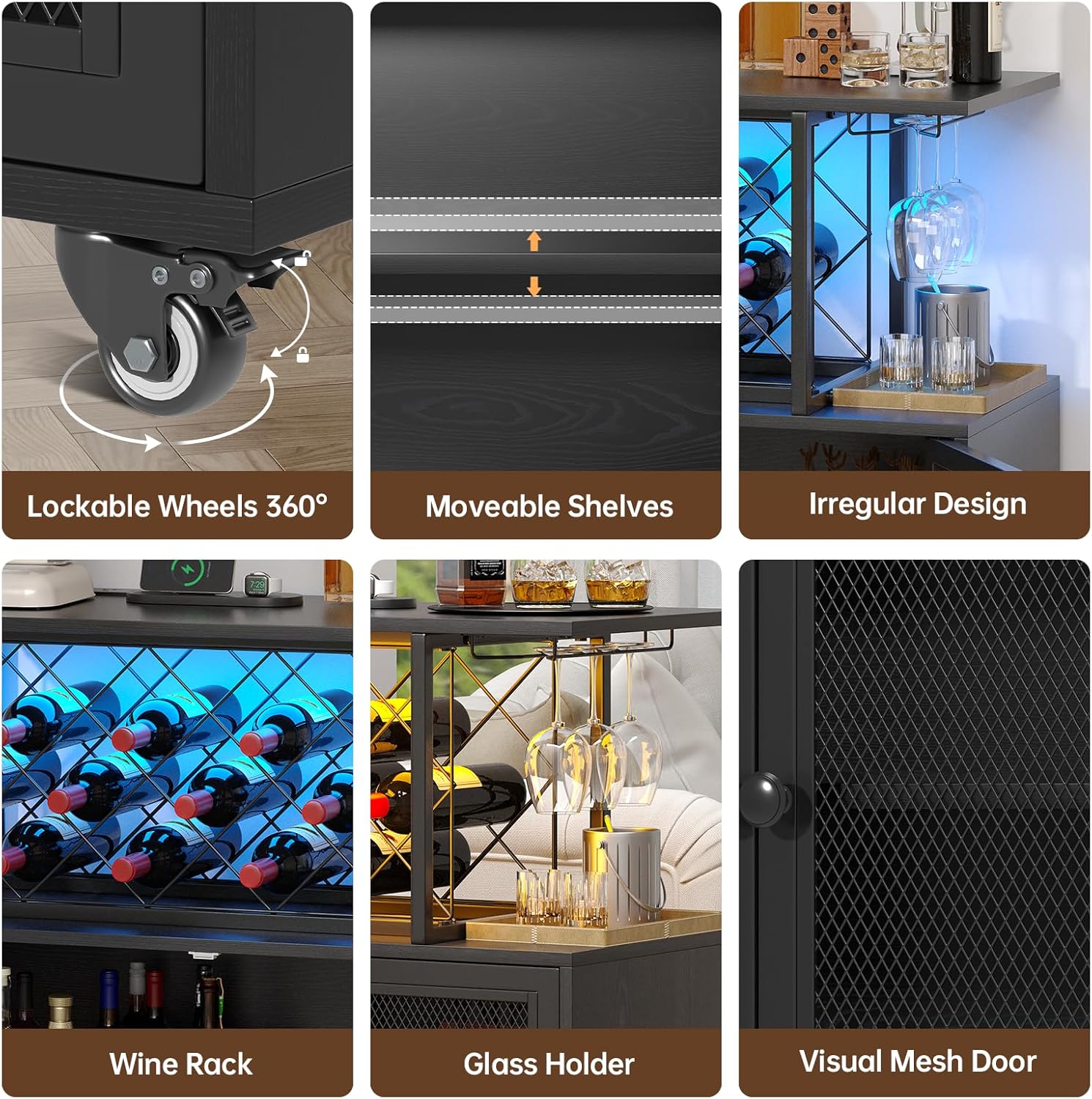 Wine Bar Cabinet with Wheels, 4-Tier Bar Cart with Power Outlets and LED Light, Liquor Cabinet Home Mini Bar with Wine Rack, Coffee Bar Cabinet for Liquor, Black