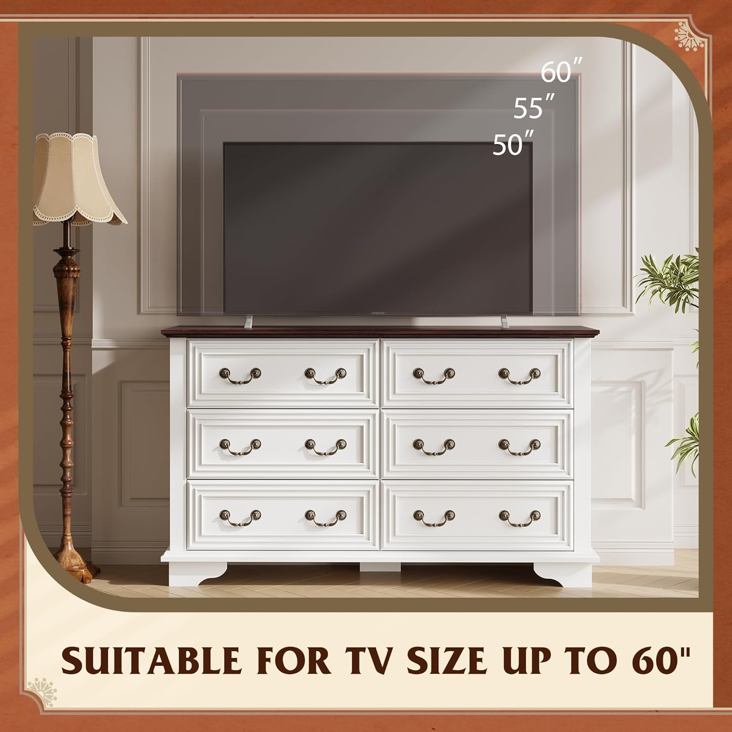 - 【Spacious Storage Space】The bedroom dresser measures 15.75"D x 51.97"W x 30.94"H, comes with 6 large drawers to store and sort clothes/toys/blankets and other household items. This dresser organizer also works perfectly as a TV cabinet and can hold up to a 60-inch TV.
