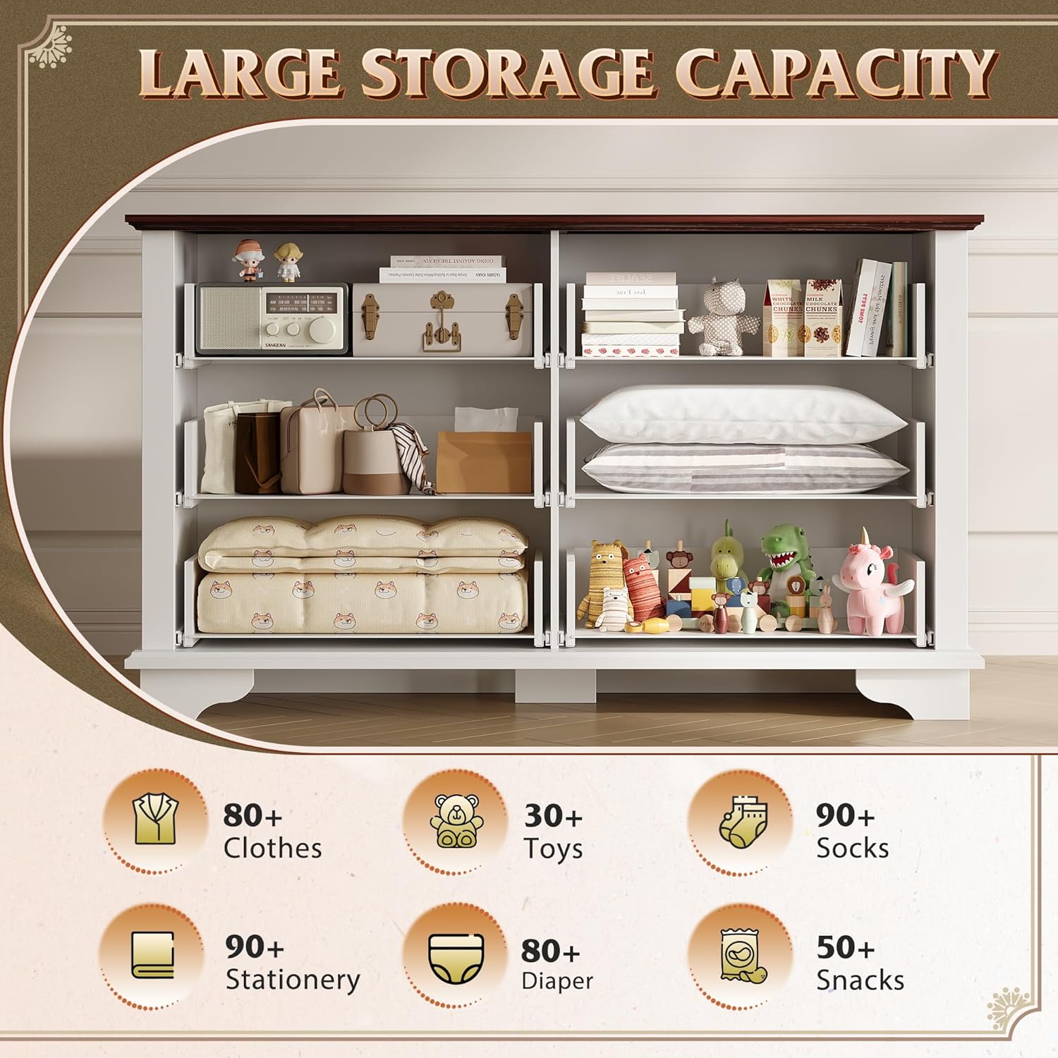- 【Safe and Sturdy】The dressers & chests of drawers are made of durable engineered wood, featuring a thick tabletop that can support heavy items. Sloping edges and widened legs improve stability. An anti-tipping device ensures child safety by preventing wobbling and tipping.
