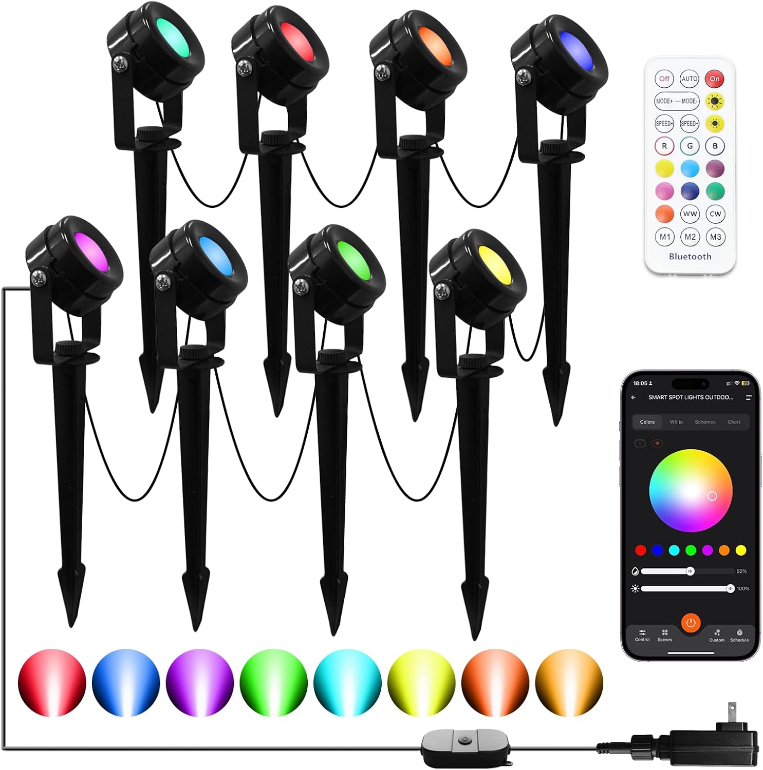 Smart RGBW Spot Lights Outdoor, 8 Pack Low Voltage Landscape Lighting with APP & Remote Control, Waterproof and Timing, Color Changing Outdoor spot Lights for Yard Halloween Christmas Decorations