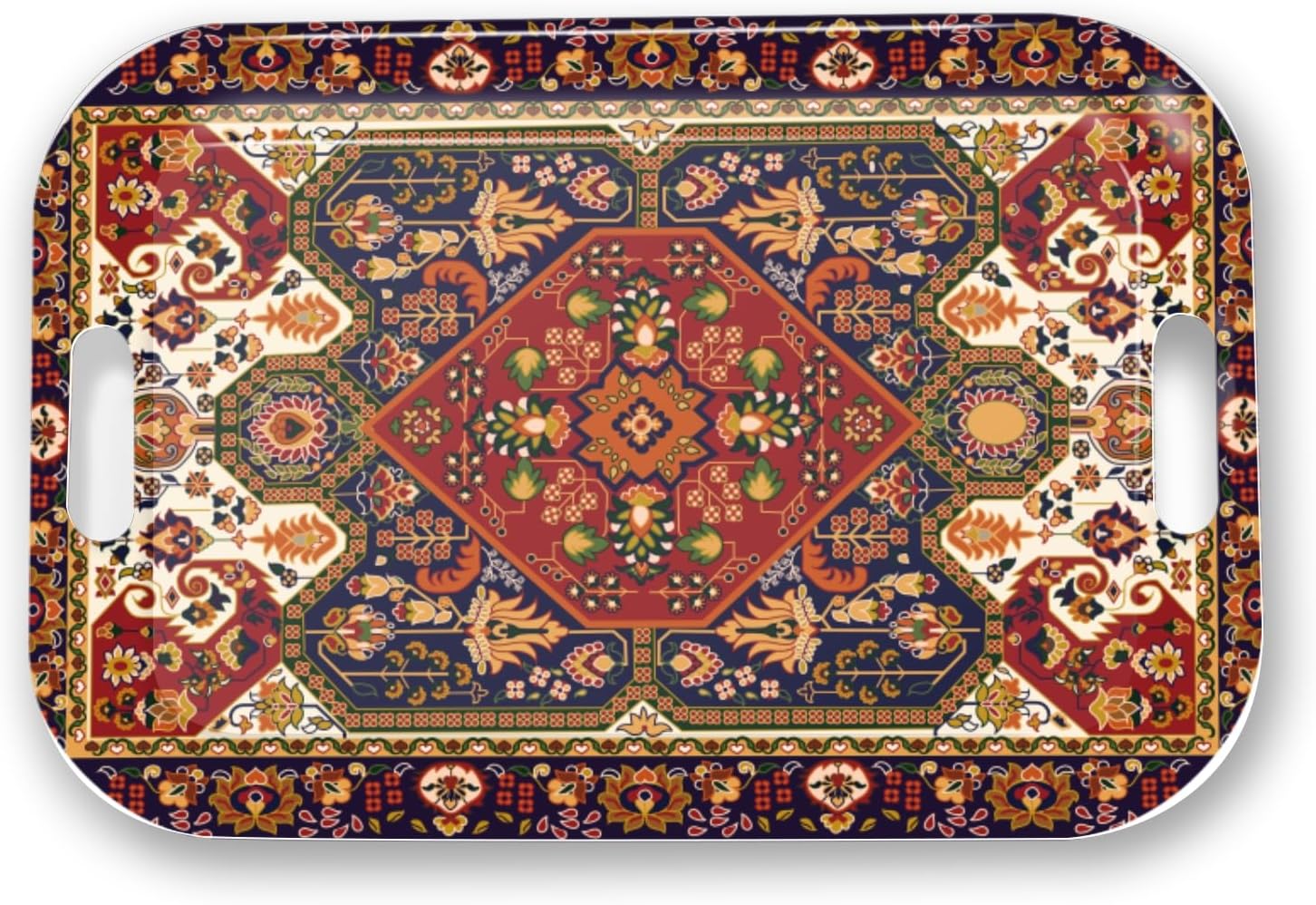 Serving Trays with Handles, 14.5 x 9.8 inch Rectangular Plastic Tray for Restaurant, Kitchen, Dark Red Pattern