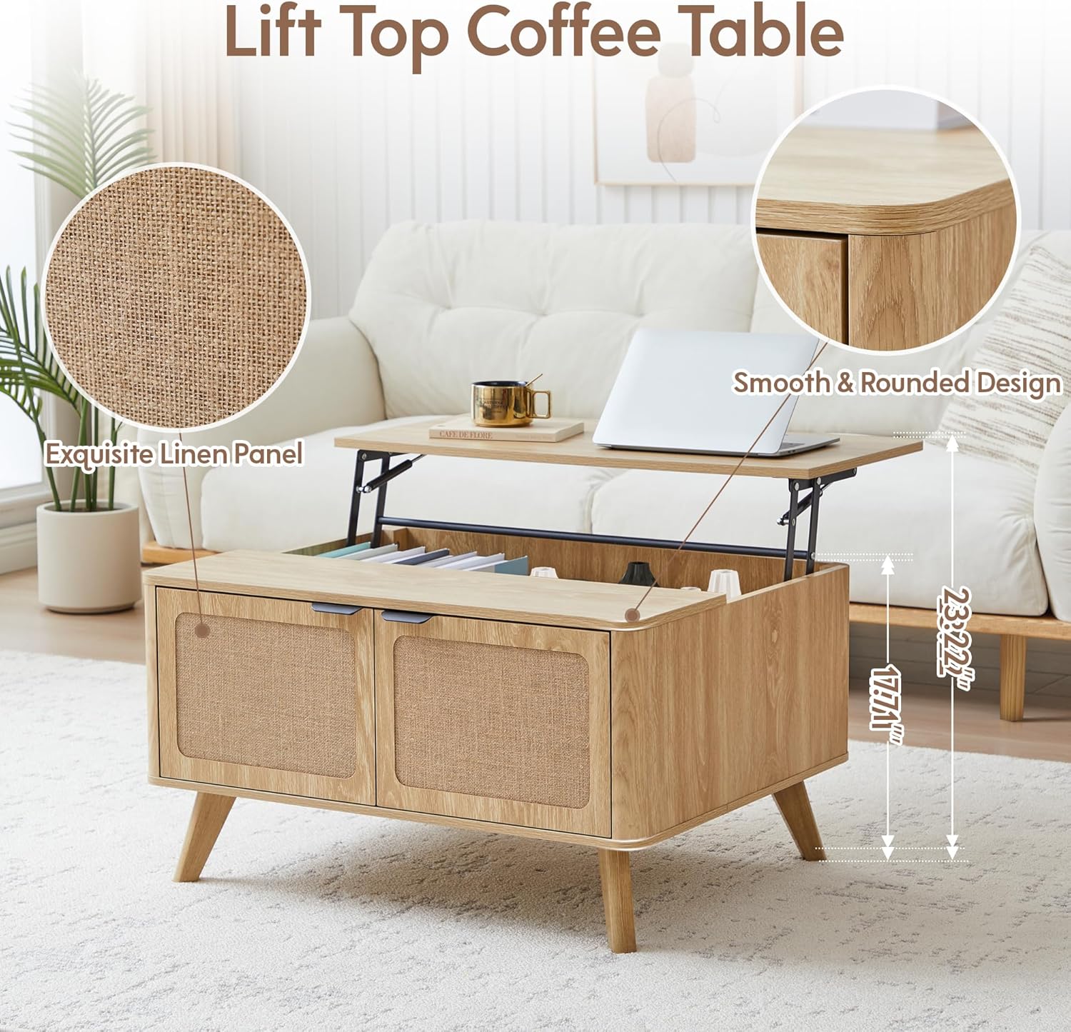 - Boho Coffee Table: Infuse your living space with relaxed bohemian charm and modern sophistication. This lift up coffee table features a warm natural wood finish paired with two front doors wrapped in breathable natural linen fabric. The combination of clean lines and organic texture offers a inviting look, perfect for Boho, coastal, modern, or farmhouse interiors.