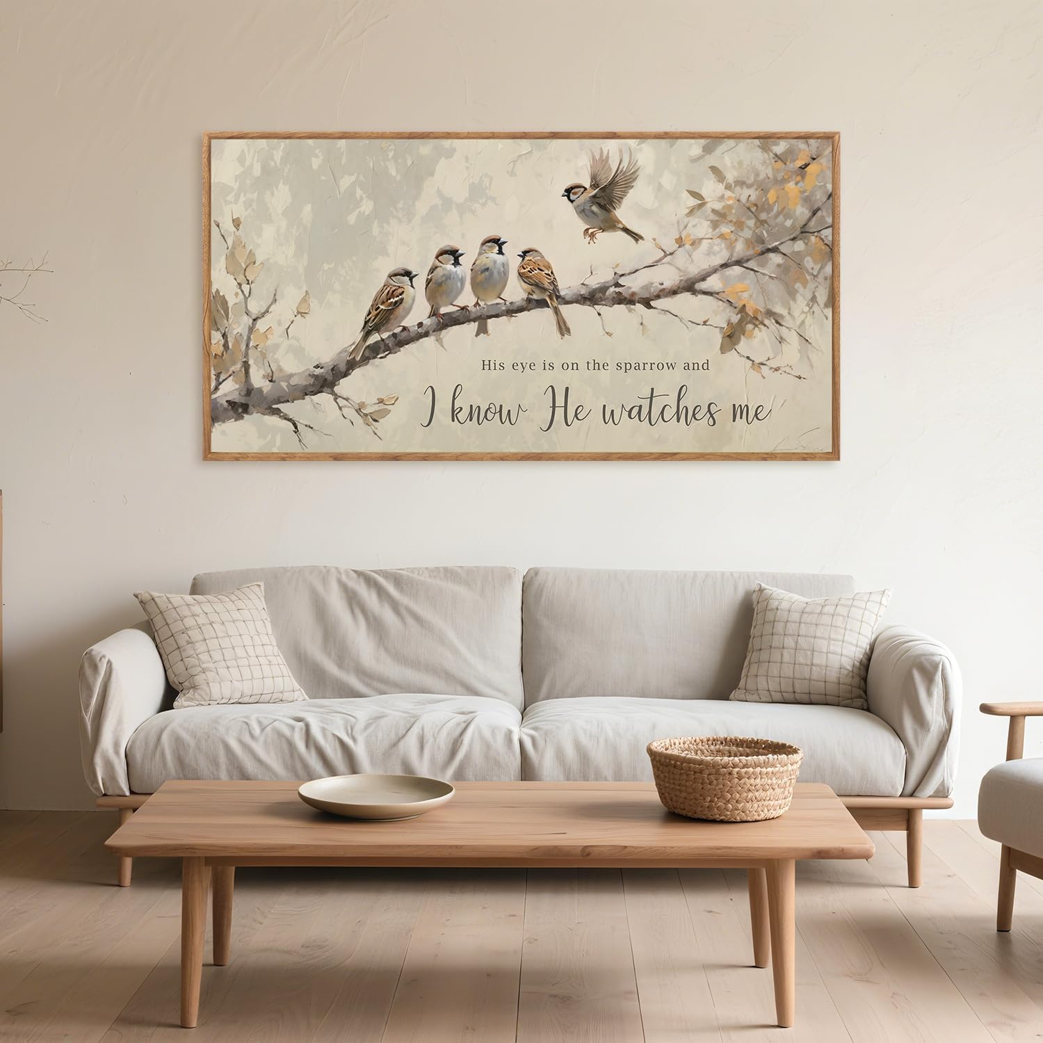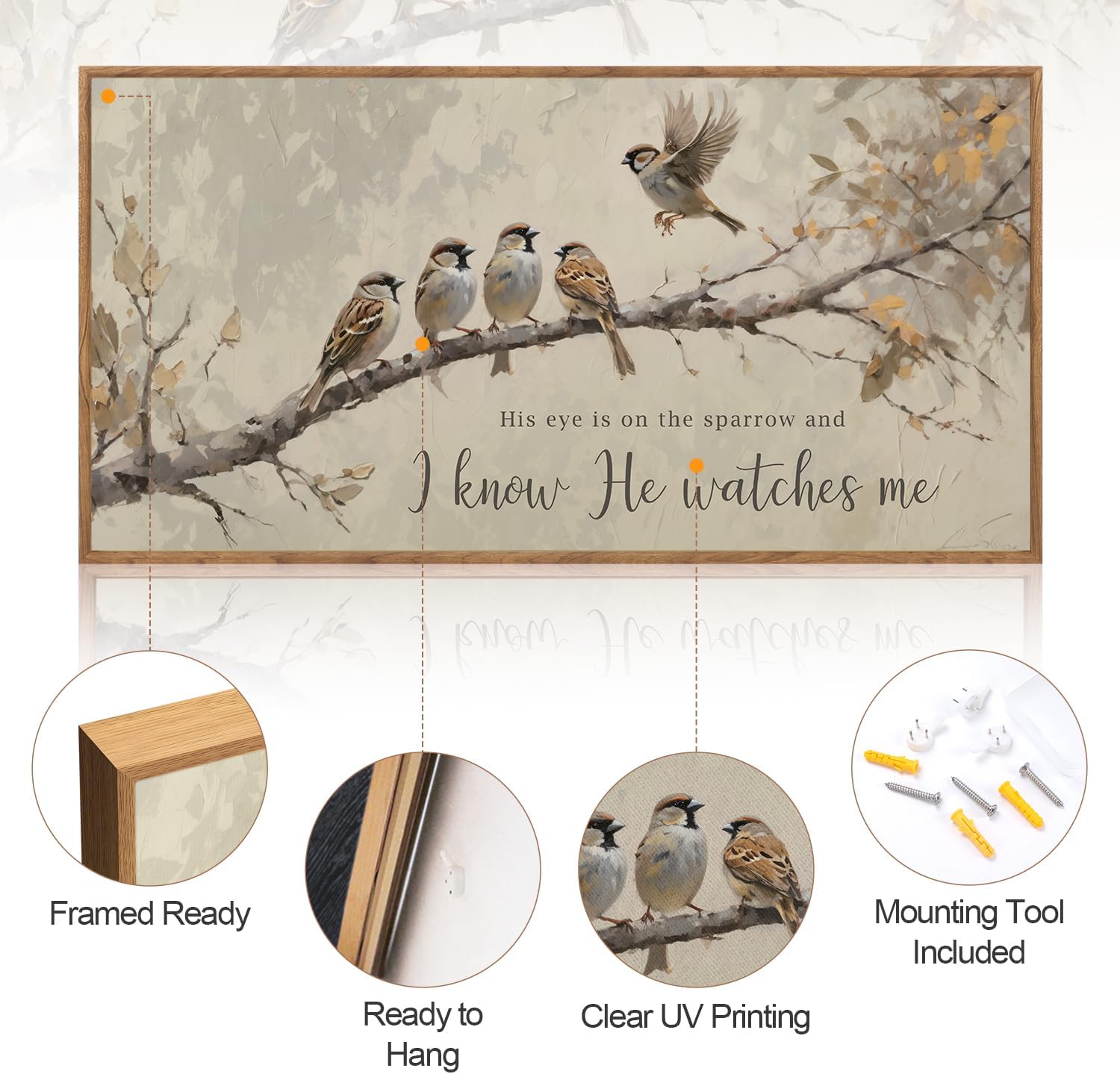 Aurlan His Eye is on the Sparrow Christian Wall Art Framed(40"x20"), Vintage Neutral Birds on Tree Branch Nature Canvas Artwork, Religious Faith Gift Bible Verse Scripture Print Decor for Home Office Bedroom