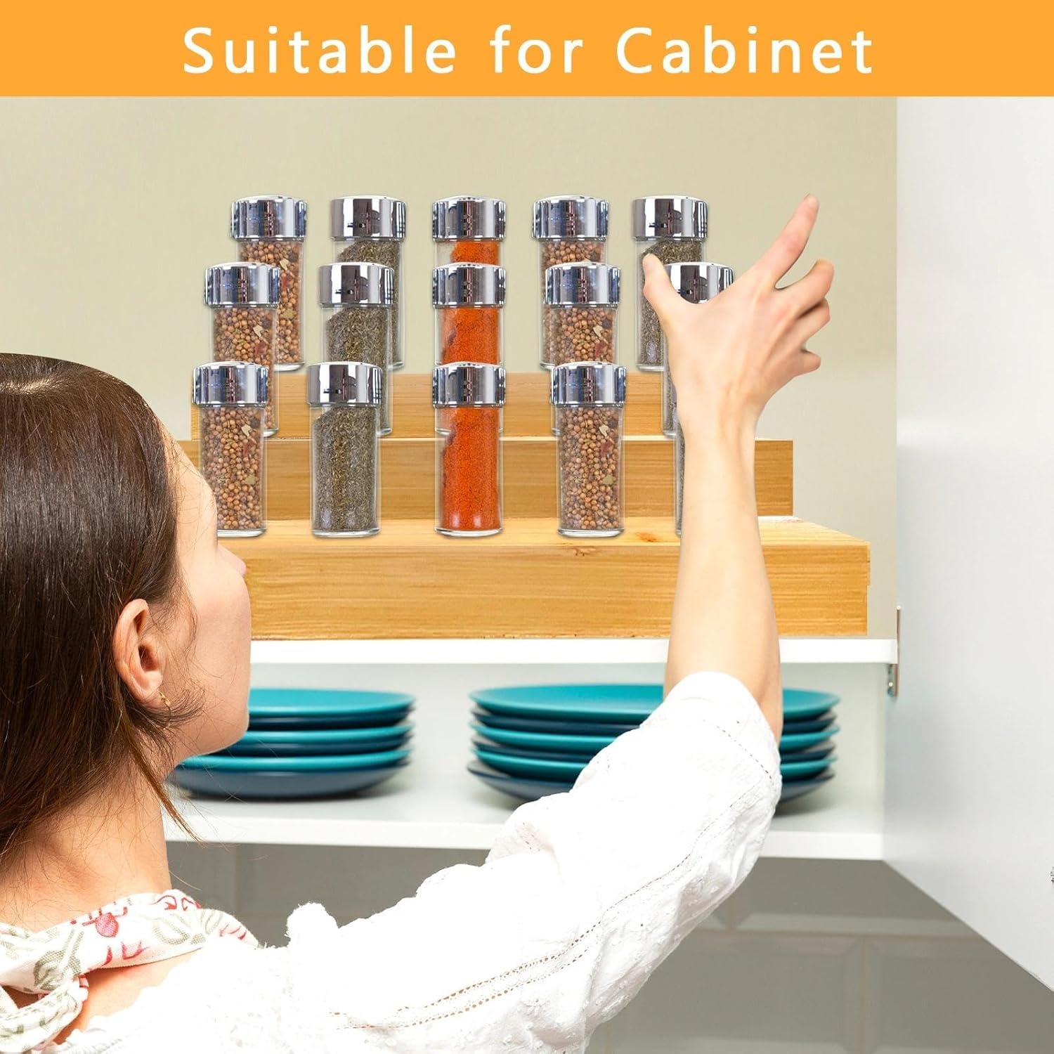 - [Bamboo Spice Rack] The seasoning rack is crafted from high-quality natural bamboo and undergoes a double-layer painting process, resulting in a smooth, refined surface that accentuates the natural grain and color of the bamboo while significantly extending durability and service life of the spice organizer.