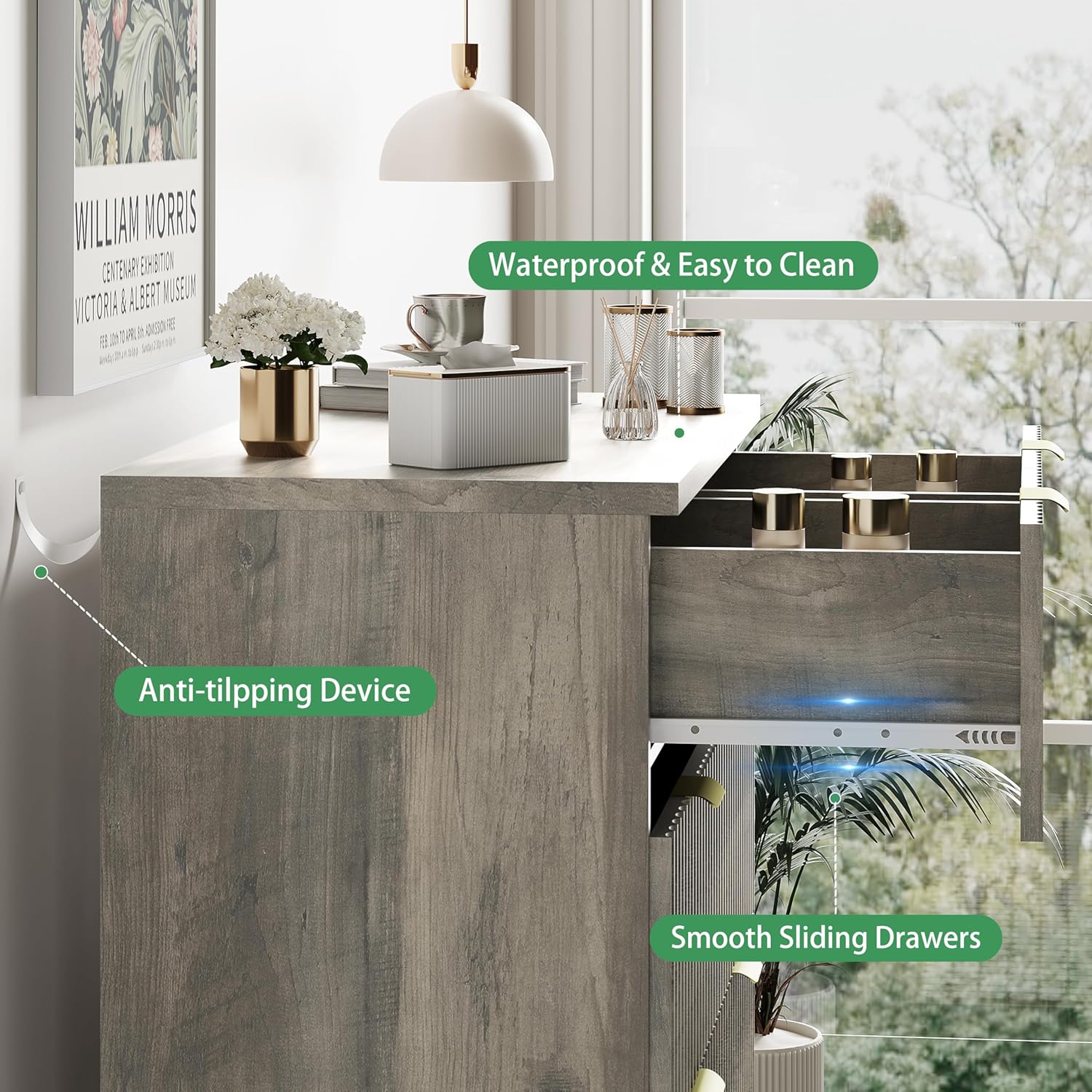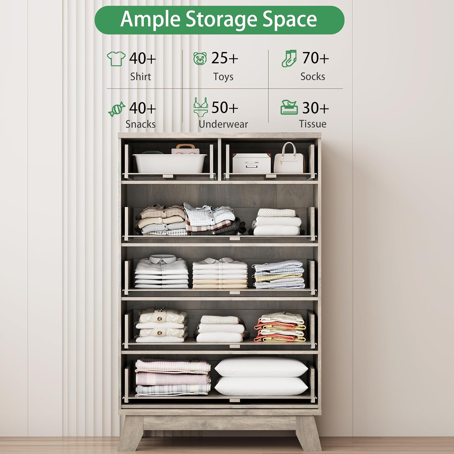 - γStability & SafetyγThe white/black/natural oak/grey dresser is equipped with an anti-tipping device, which can be fixed on the wall to prevent accidents. Each drawer contains a wide metal handle and built-in slide rail, easy to push and pull. Besides, the sturdy base provides this dresser with drawers a strong support and the middle feet can be adjustable to keep balance on uneven floors