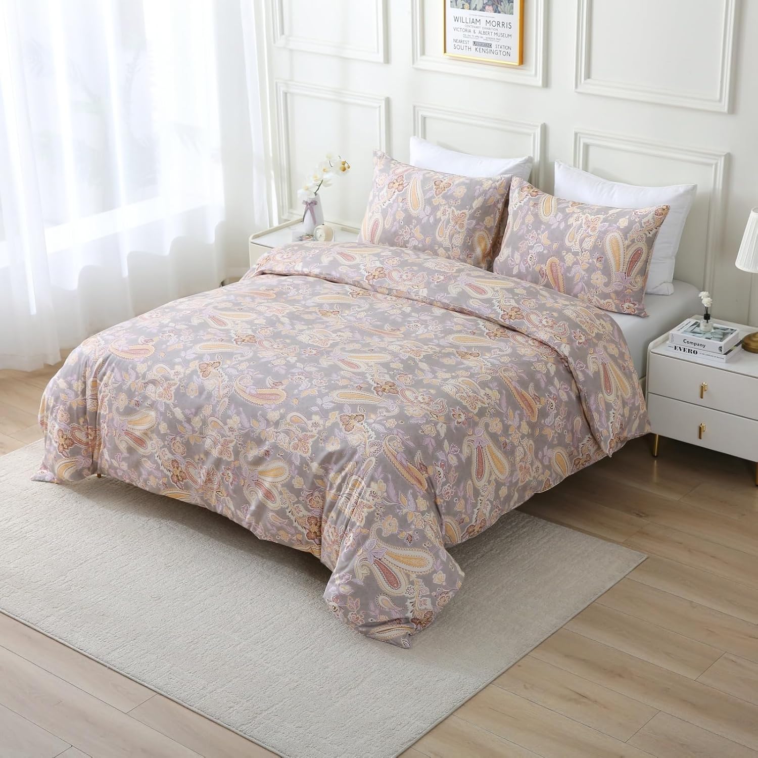 ABREEZE Paisley Bedding Sets 3Pcs Brushed Cotton Duvet Cover Set Queen Size Rustic Damask Gold Floral Comforter Cover with Zipper Closure Boho Bedding Collections
