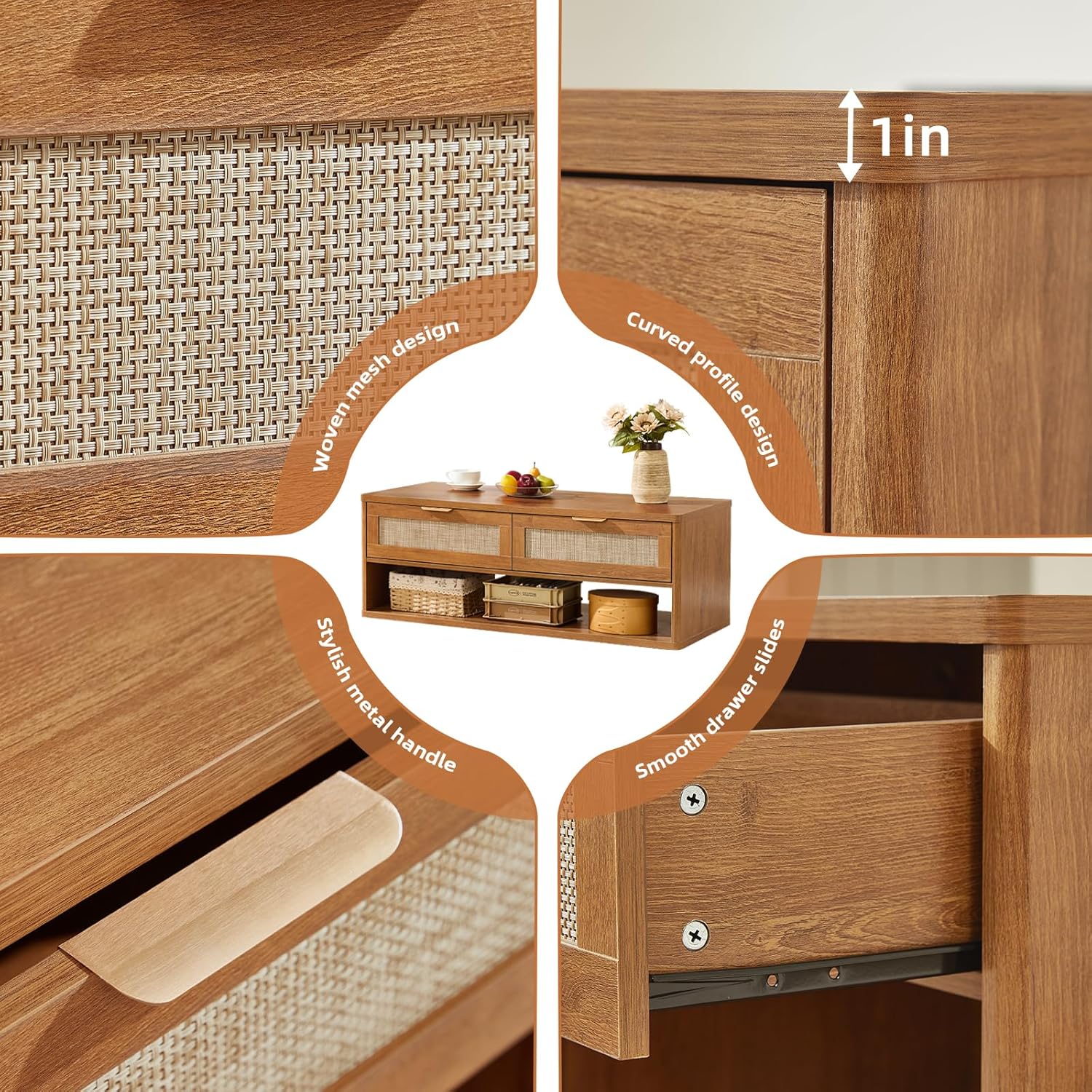- Quality Metal & Wood Material:This wooden coffee table is equipped with two equally sized drawers that feature quality metal handles and smooth-gliding metal runners. Its structure combines a robust wood frame with a woven rattan design. The curved-edge design of the tabletop enhances safety, particularly for families with children.