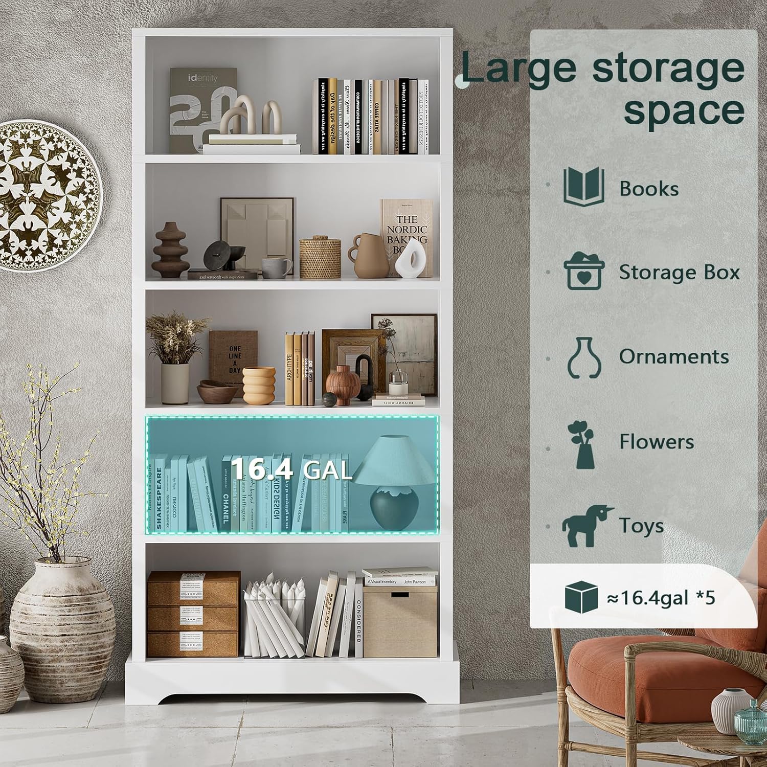 - 【STYLISH DESIGN】TVU 5-Shelf Bookcase features a sleek and minimalist design that adds a touch of elegance to any room. Its clean lines and simple structure make it a versatile choice for various room decors