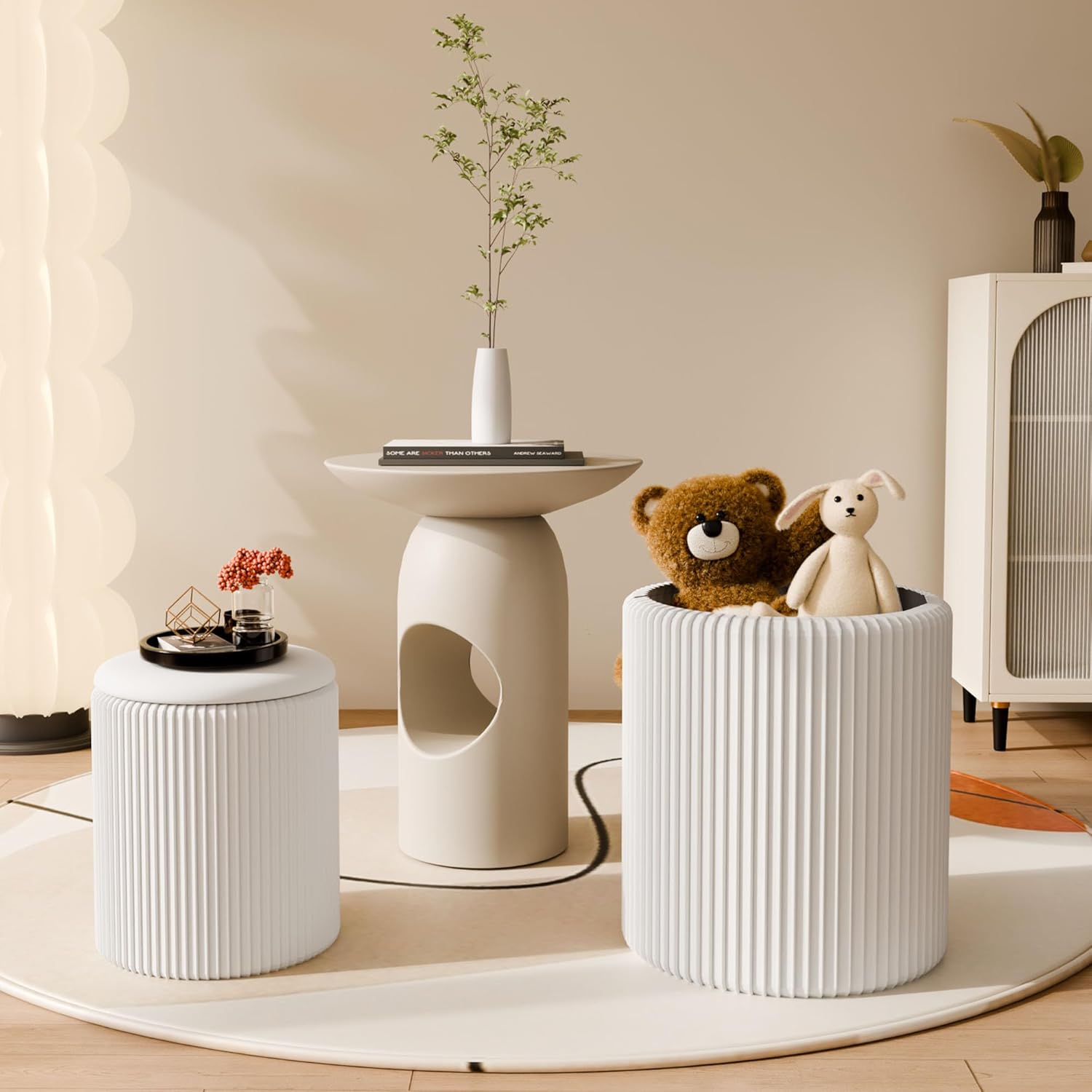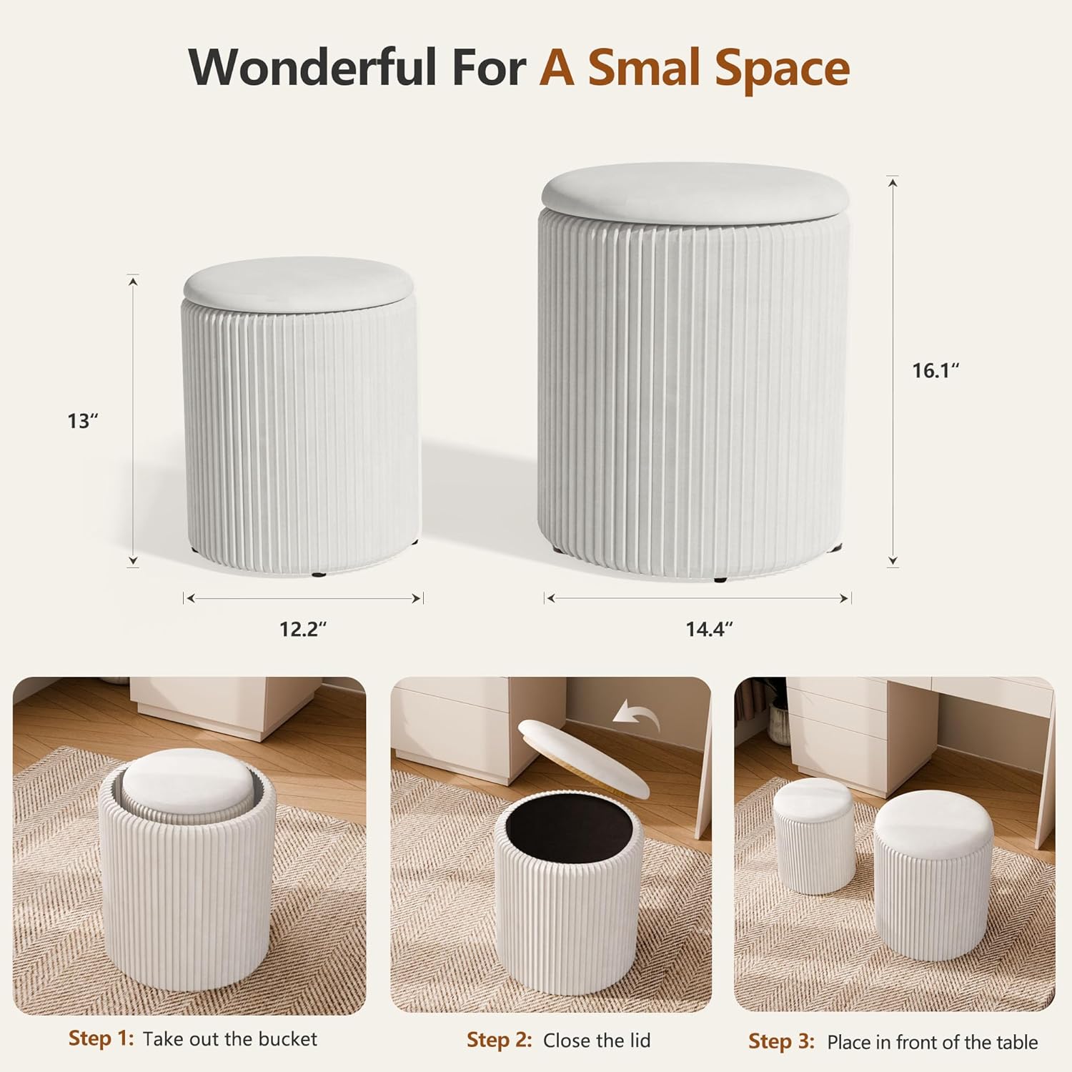 Ottoman with Storage Set of 2, Velvet Storage Ottoman, Upholstered Sponge Vanity Stool Support 300lbs, Multifunctional Coffee Table Foot Rest Ottomans for Living Room Bedroom, White
