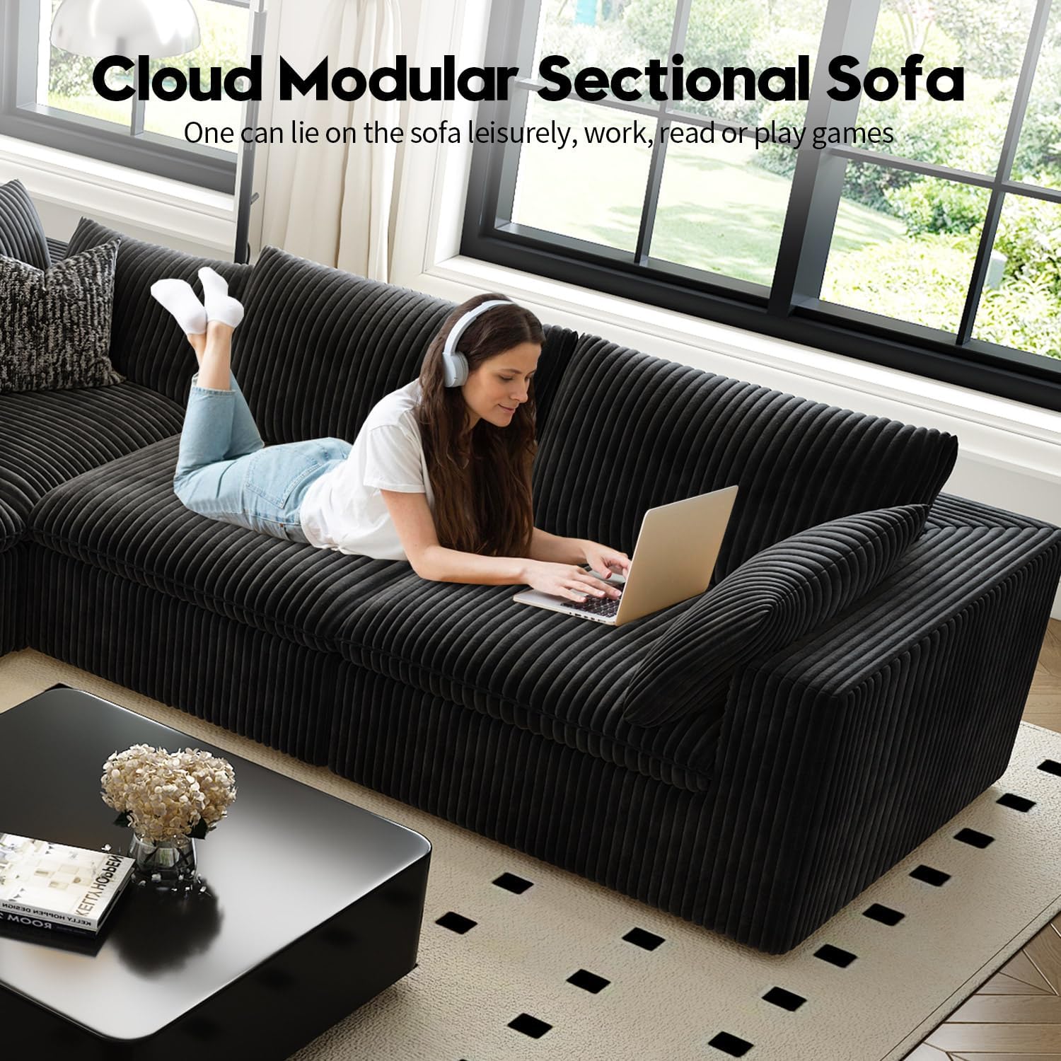 157.5" Cloud Couch Modular Sectional Sofa for Living Room,Modern Sofa with Deep Seat,4 Seater Boneless Couch,Comfy Upholstered Corduroy Couches for Apartment, Studio, Office,Bedroom,Black