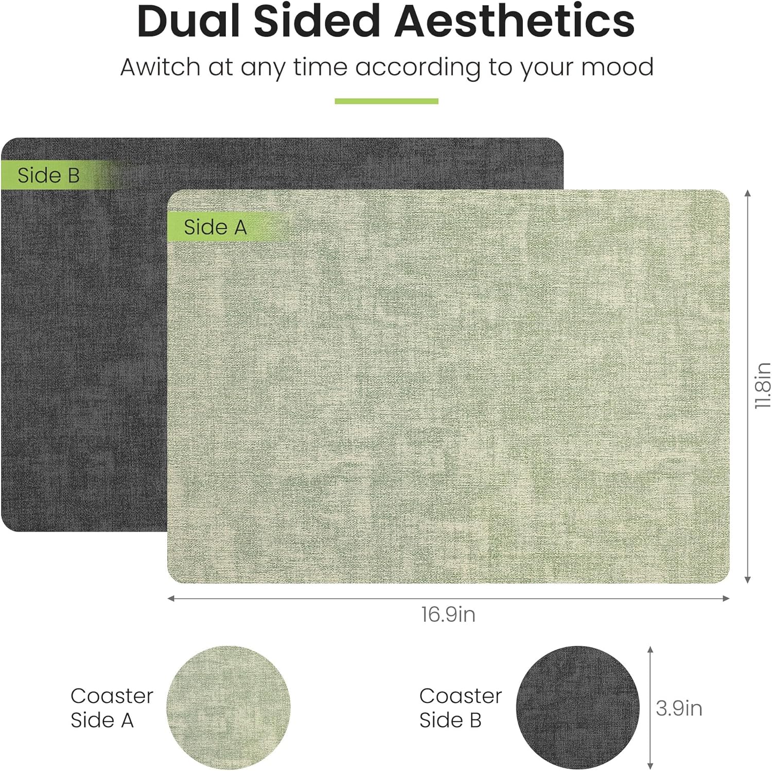 - COST-EFFECTIVE LEATHER PLACEMATS: Our faux leather placemats are made of high quality faux leather, which ensures superior quality and long-lasting durability. Designed with different colours on both sides, it is equivalent to having two different placemats, our placemats are reversible, so you can switch between the two colours at will depending on the occasion or mood. It also comes with a combination of coasters to protect the cups while providing a better dining experience for the diner