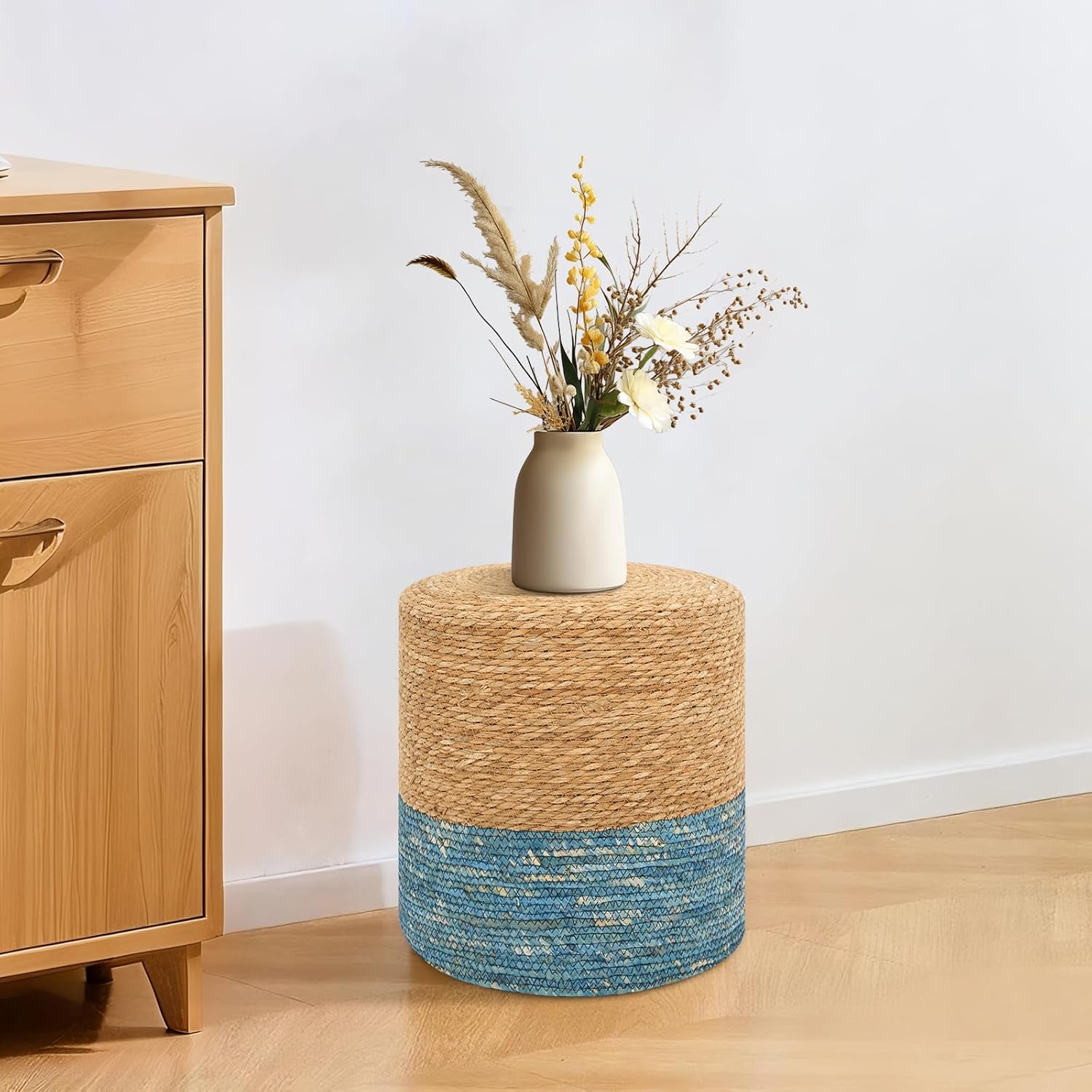 Pouf Ottomans, Handwoven Natural Straw Footstool, Round Braided Outdoor Patio Stool with Wood Frame, Boho Decor Accent Seat Balcony, or Garden (Blue)