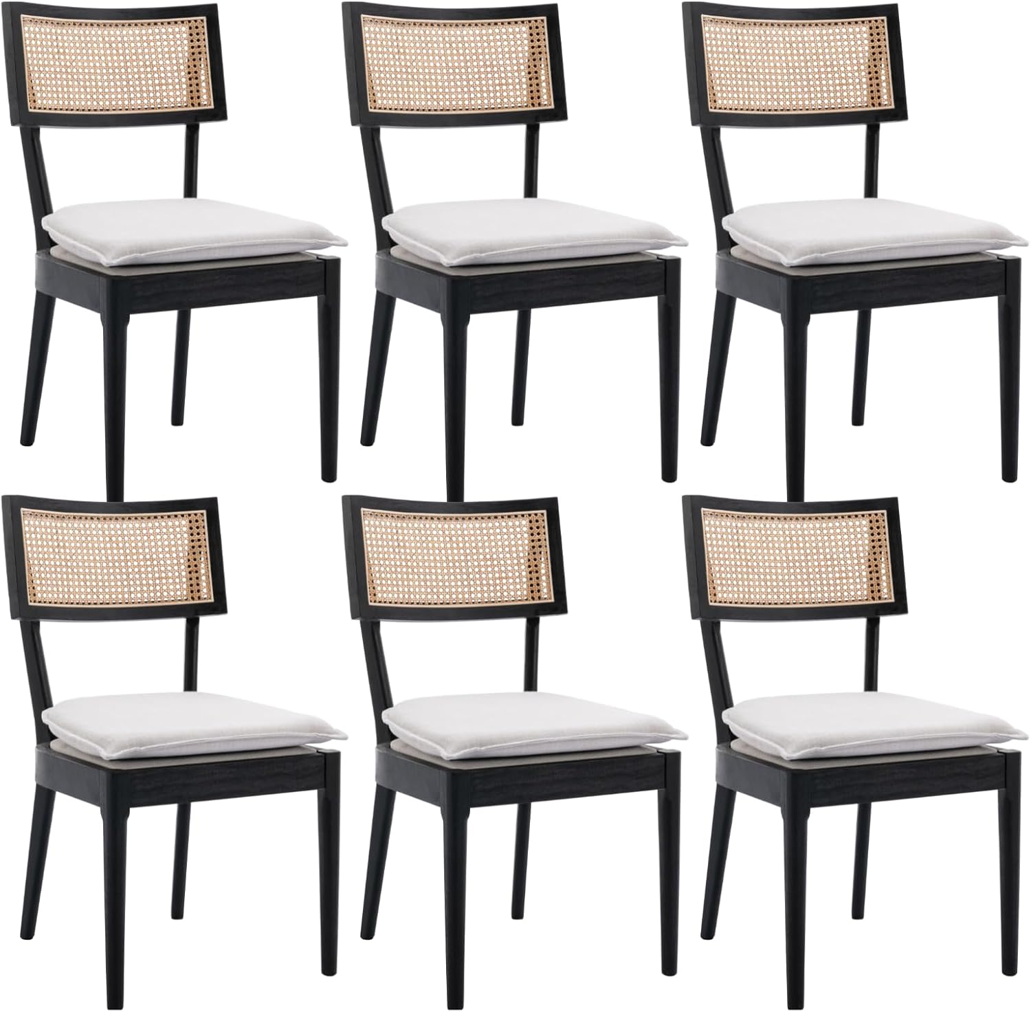 Rattan Dining Chairs Set Of 6 , Mid Century Modern Black Wooden Cane Back Chairs with Removable Linen Cushion , Retro Farmhouse Upholstered Kitchen & Dining Room Chairs for Restaurant Living Room