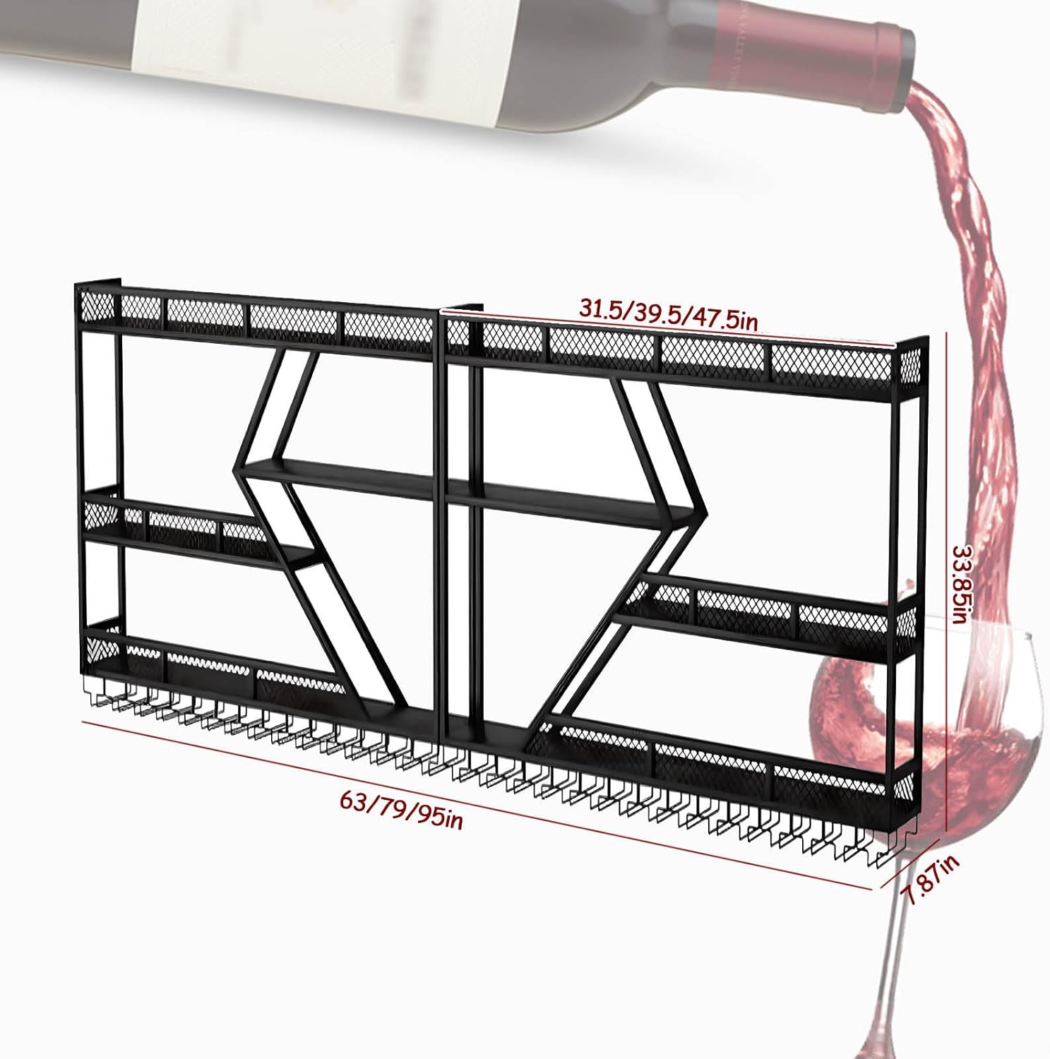 Wall Mounted Wine Rack with Glass Holder, 3-Tier Metal Storage Shelf, Black Diamond Design, Wine Bottle Display with Stemware Storage (Black, 94.48in/240)