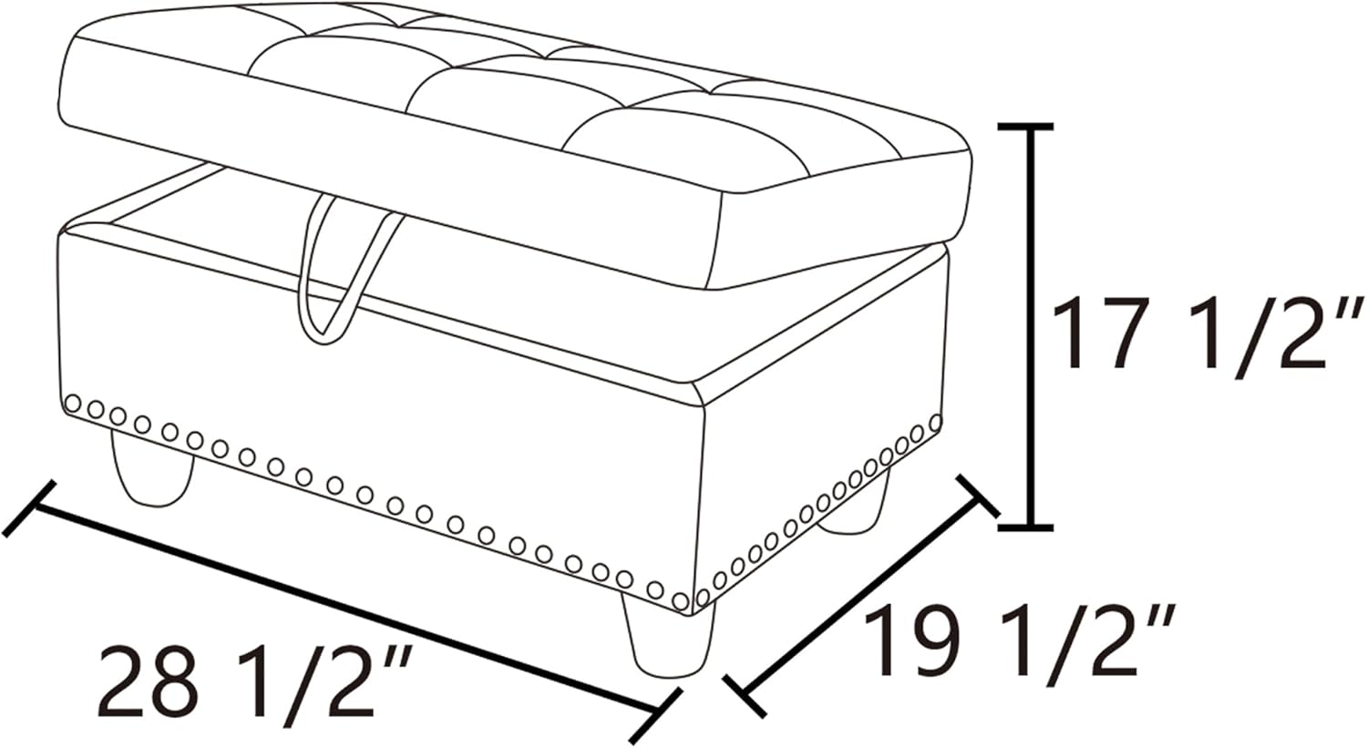 - DIMENSIONS: Measuring 28.5" L x 19" W x 17.5" H, this storage ottoman is perfectly sized to fit effortlessly into your space. With a weight capacity of up to 300 lbs, it offers both style and durability, serving as a sturdy seating option or reliable storage solution for your home.