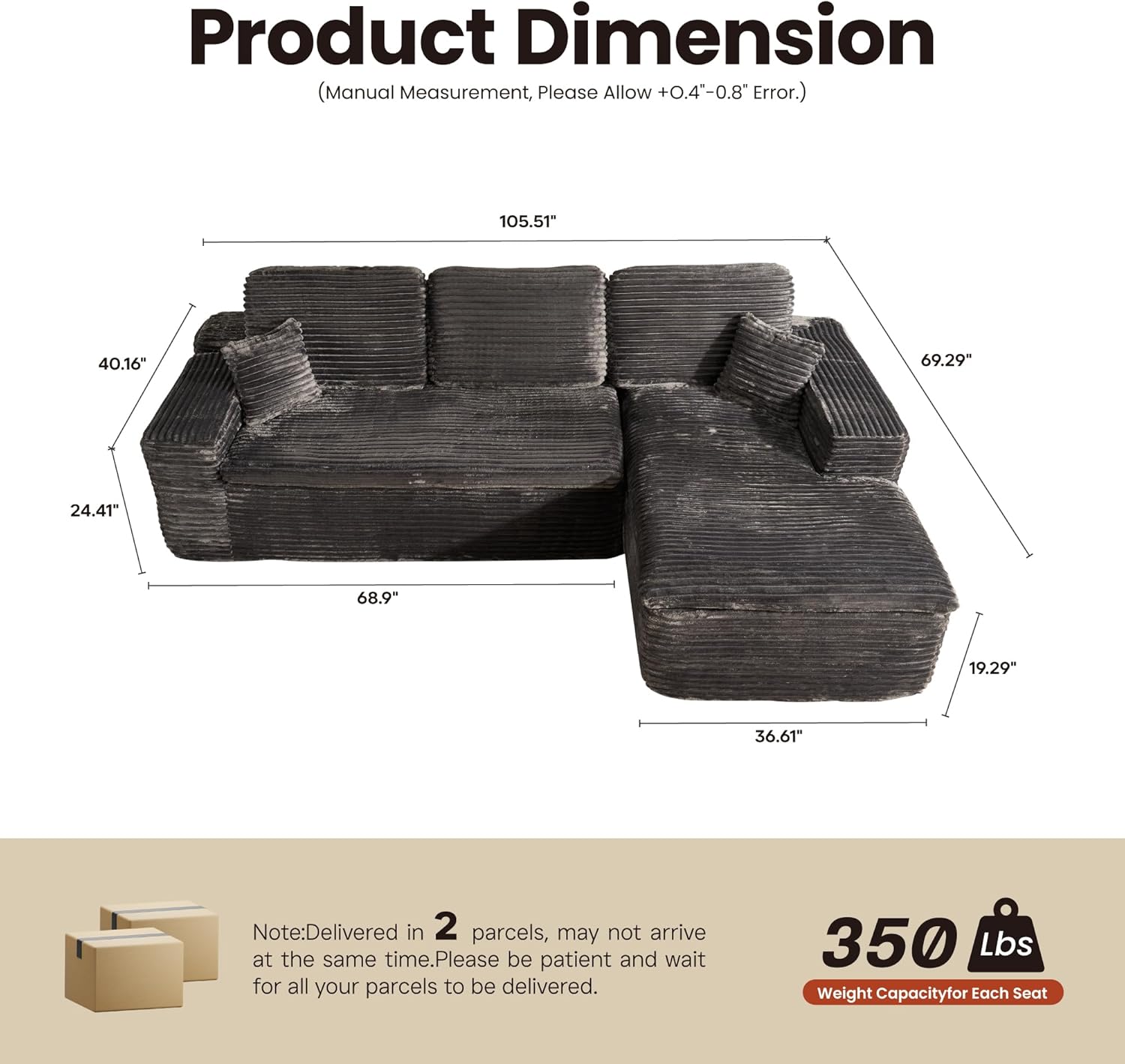 ovios 105” Modular Sectional Sofa with Thicken Seat Cushion, Cloud Couch with Deep Seat, Modern L-Shape Sofas Couches with Chaise,Upholstered Couches for Living Room Bedroom,Grey