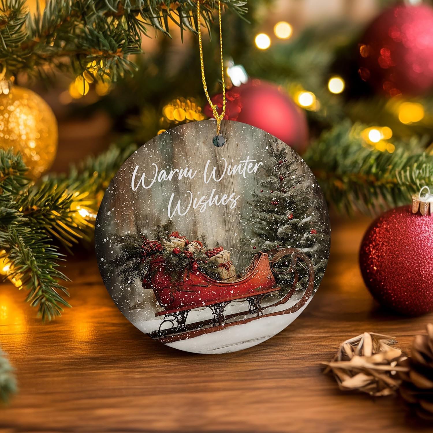 Vintage Rustic Christmas Ceramic Ornament Gifts, Farmhouse Winter Snowy Christmas Sleigh Decorative Hanging Ornaments for Xmas Tree Holiday Party Decoration, Winter Xmas Tree Decorations