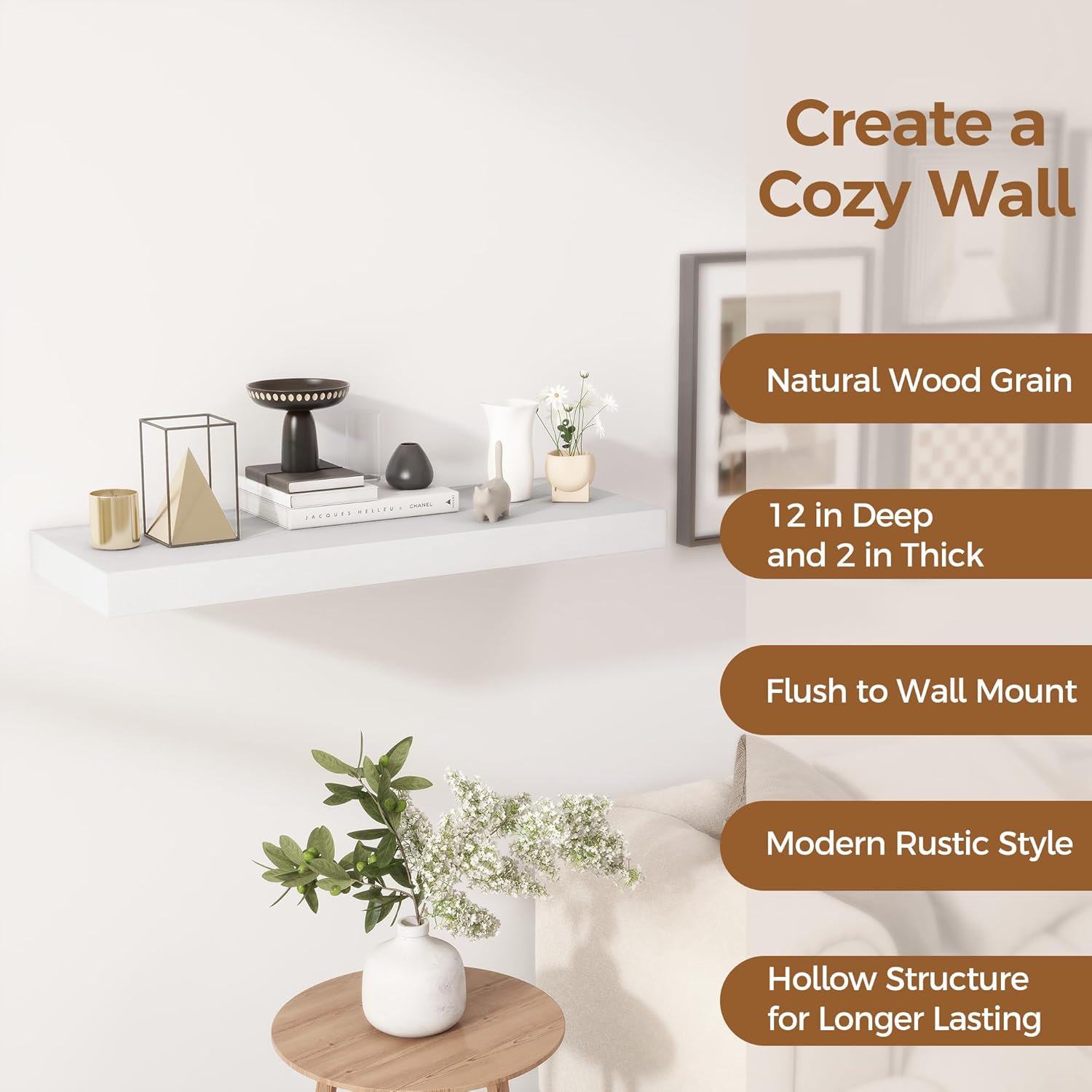 - 【12 INCH DEEP FLOATING SHELF】This extra deeper and thicker wall shelves are 12 inches in depth and 2 inches in thickness instead of the regular narrow floating shelves, you can put photos, pictures, DVD players, videos, books, toys, and some other knickknack on this beautiful display wooden shelf.