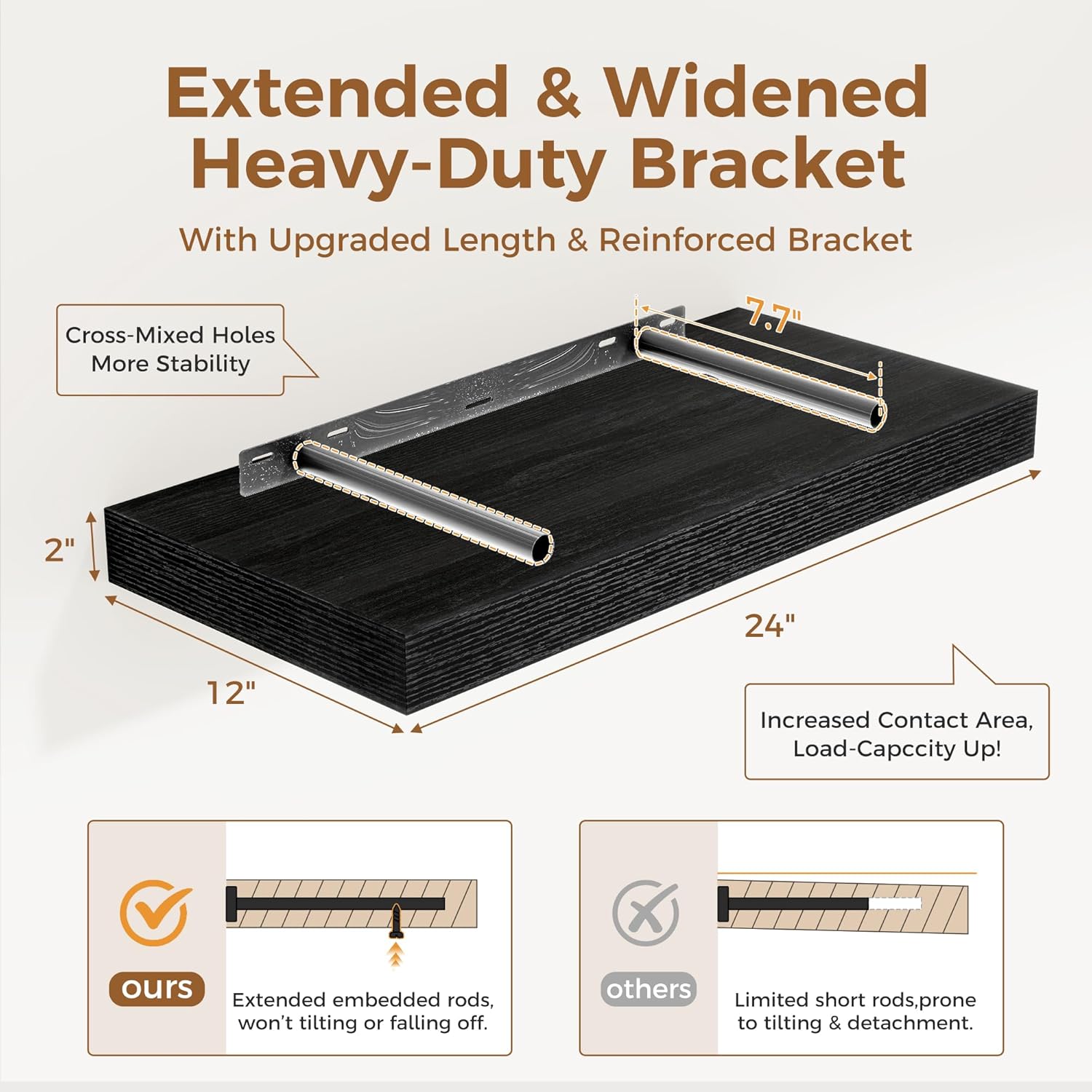 12 Inch Deep Black Floating Shelves, 24 x 12 Floating Shelf for Books, Rustic Wood Deep Wall Shelves for Home Storage & Display, 2" Thicked Shelves for Kitchen, Living Room, Bedroom, 2 Pack