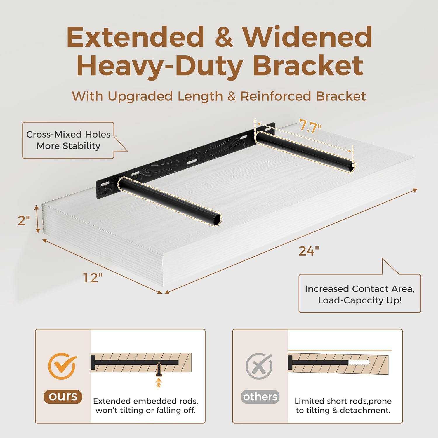 12 Inch Deep White Floating Shelves, 24 x 12 Floating Shelf for Books, Rustic Wood Deep Wall Shelves for Home Storage & Display, 2" Thicked Shelves for Kitchen, Living Room, Bedroom, 2 Pack