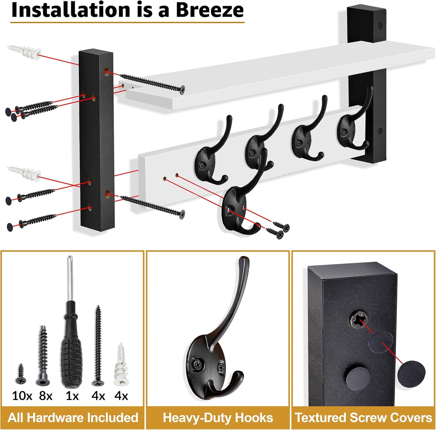 - Easy Installation, All Hardware Included – Labeled parts and step-by-step instructions make installation a breeze. Comes with screws, drywall anchors, mini level, screwdriver, and textured screw covering stickers for a clean finish. Measures approximately 23.6 L x 7.5 W x 4.7 D.