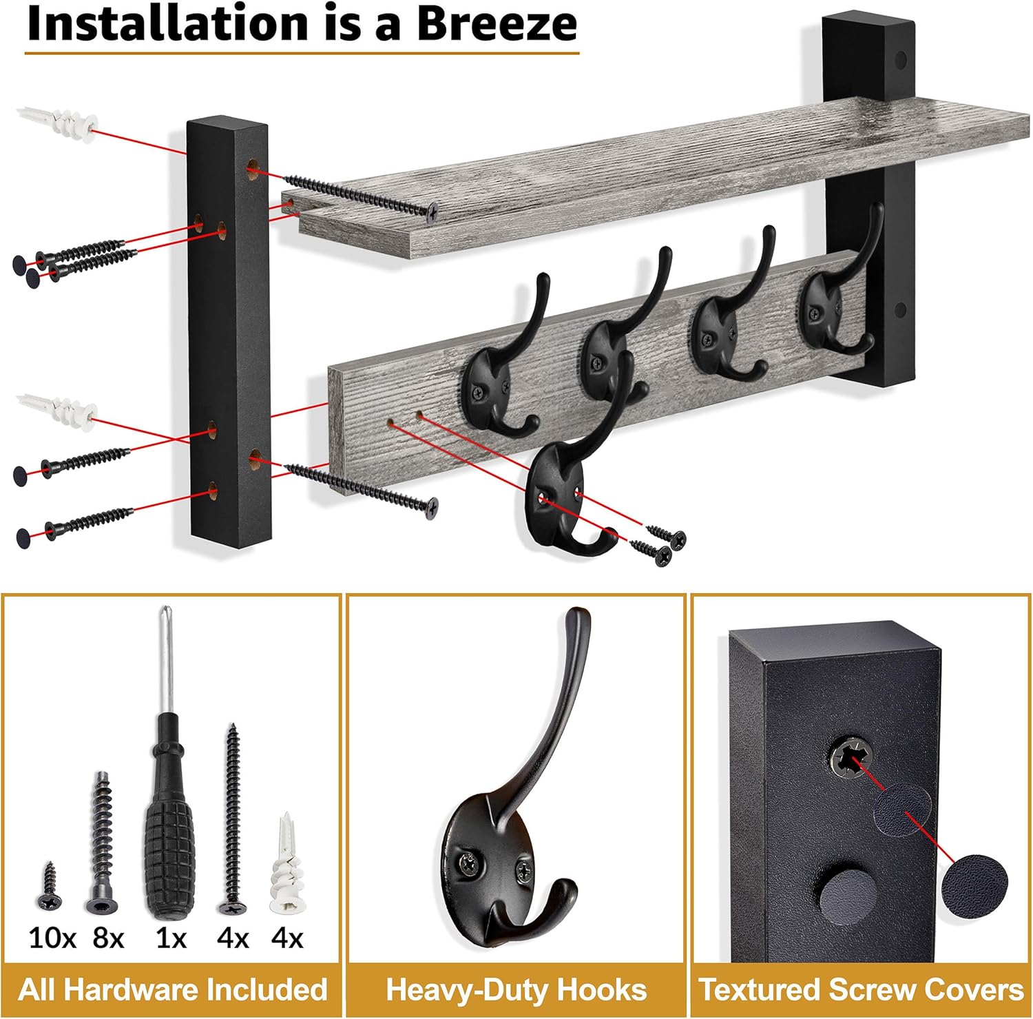 - Heavy-Duty Metal Hooks – The Shelf is made of beautiful engineered faux wood (not solid wood) featuring a smooth matte finish. Equipped with 5 metal sturdy dual hooks, our wall mount coat rack holds everything from coats to backpacks to bathrobes – built to last and resist bending, cracking, or slipping.
